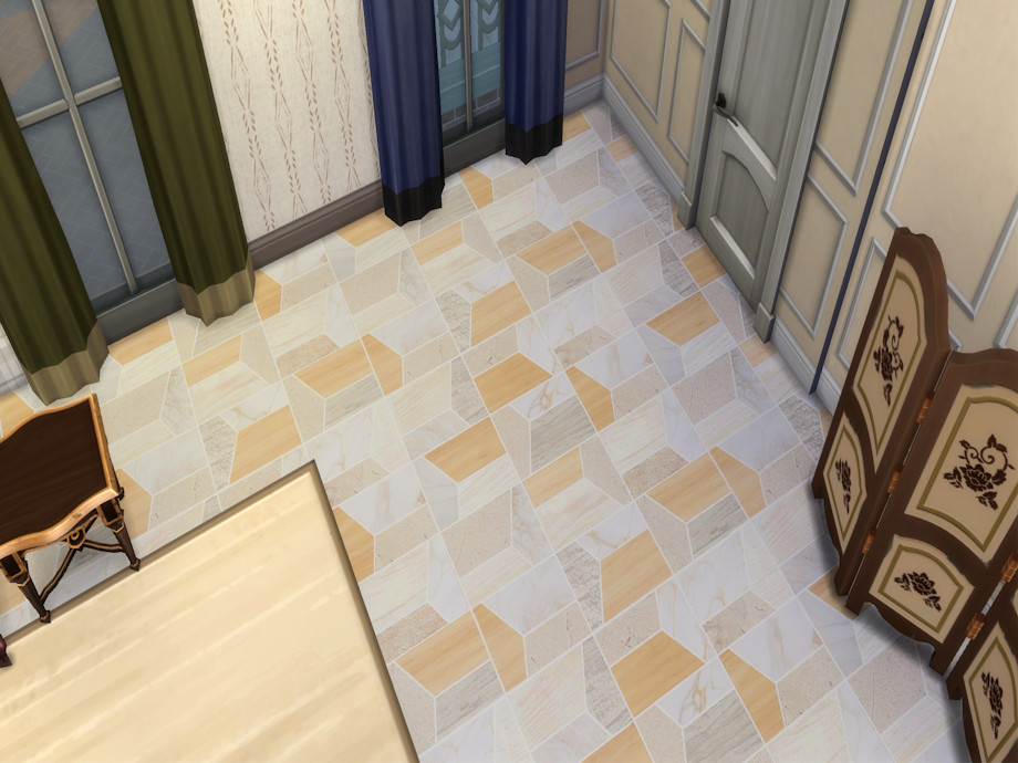 A wood and tile floor with triangle shapes, 2 sets with 5 tiles each