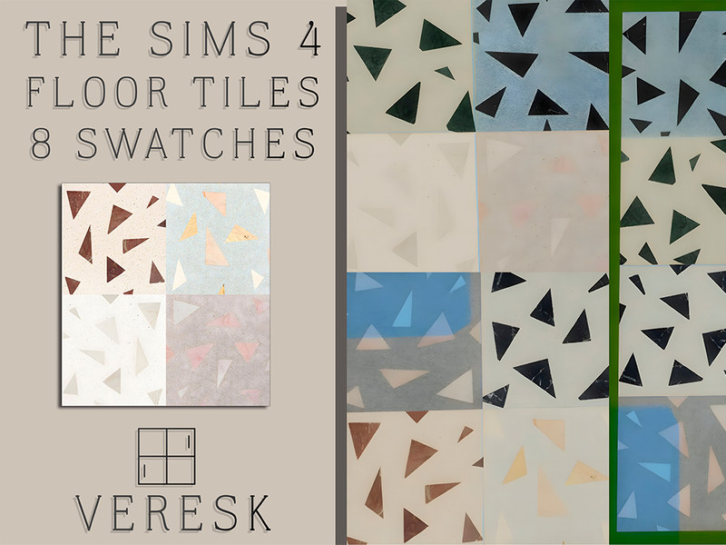 A set of 8 floor tiles with a geometric pattern of triangles, made in a pastel and neutral palette. Terrazzo-style tiles in various shades (beige, pink, blue, gray, etc.), each swatch is unique and can be combined with others.