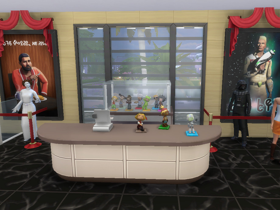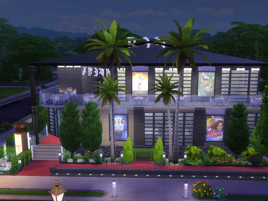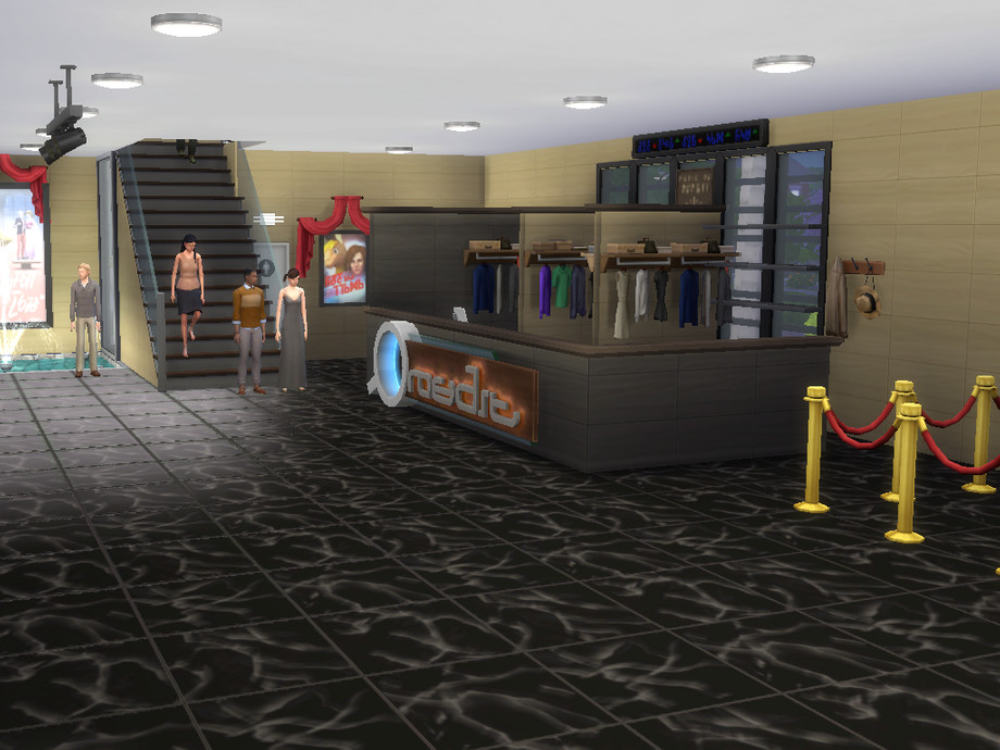 This theater includes 2 VIP Lounges.There are also common rooms.You can go to the restaurant on the 2nd floor and stock up popcorn.Cinema includes:closet, 2 regular rooms, 2 VIP rooms, a souvenir shop, 2 toilets (male/female), dining area (on the street/in the building).In this lot I did used no Custom Content.This item increases the leisure of your Sims.