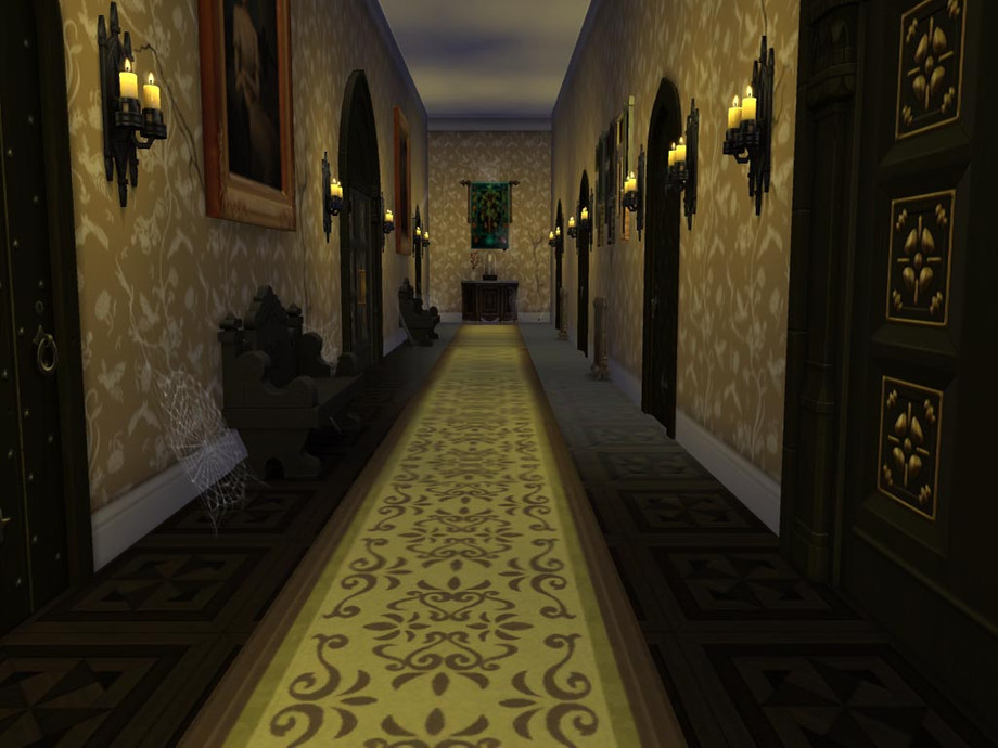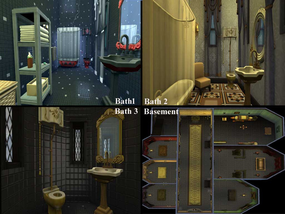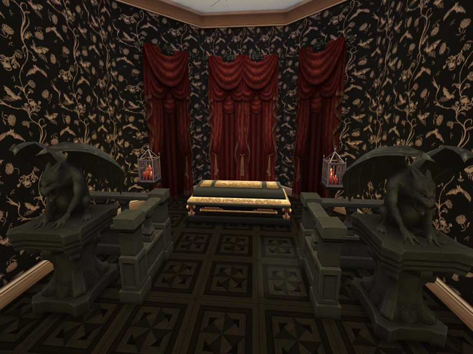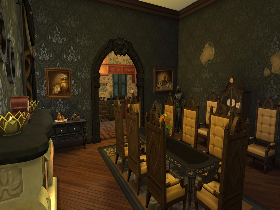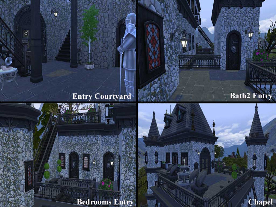 Swimmable moat, sitting room, kitchen, dining room, library, art studio, chapel, 2 bedrooms, 2 and a half baths, basement with 5 coffins and skill building room.