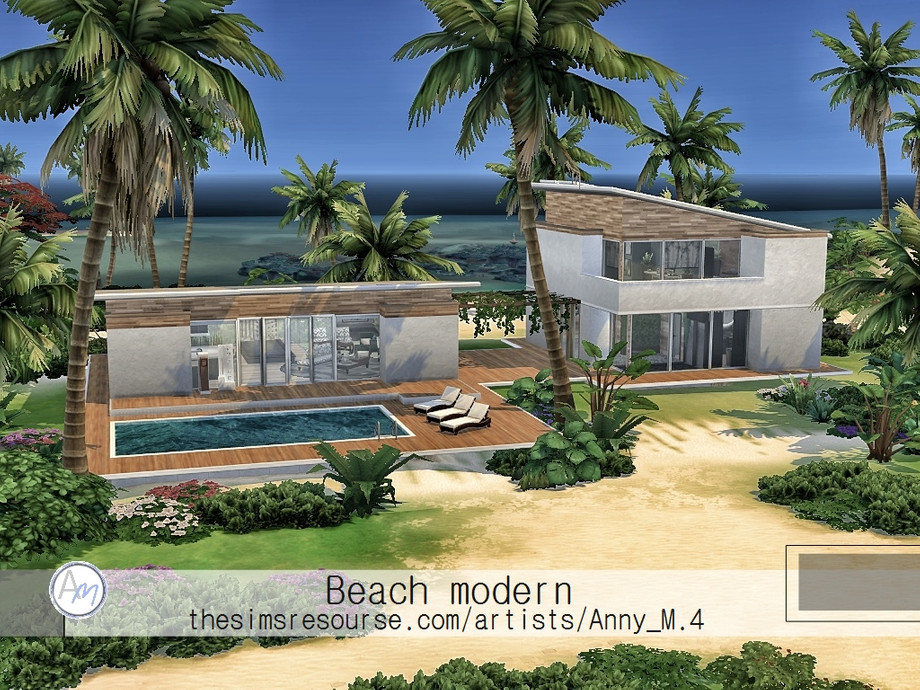 Here is a modern house on the beach.It has two stories. On the ground floor it has living room,kitchen,dining area,bathroom,bedroom and little pool zone. On the first floor it has second bedroom and bathroom. Fully playable and no CC.