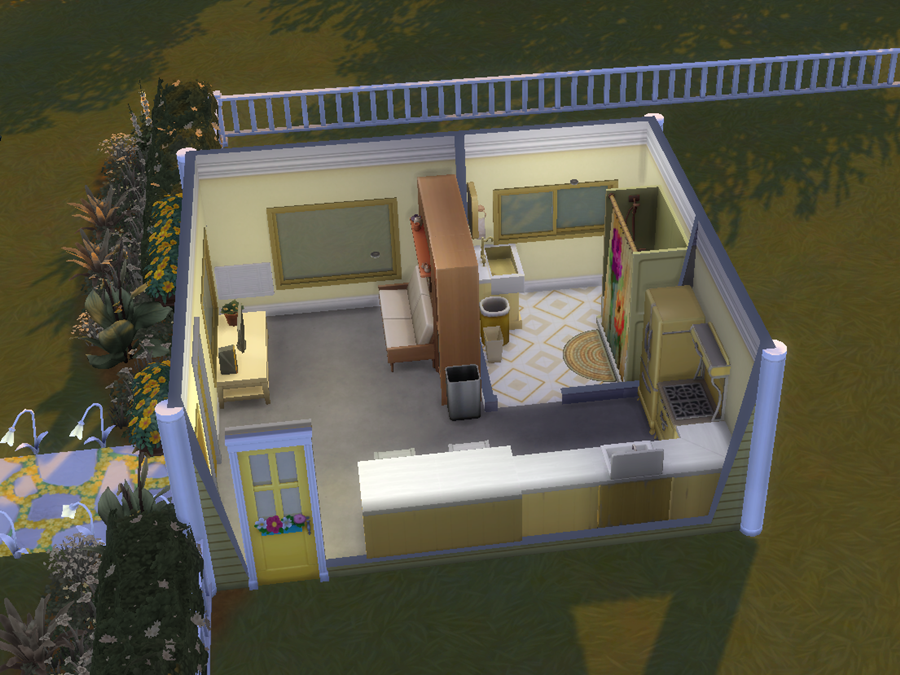 i used the DACHSHUND'S CREEK lot in BRINDLETON BAY for this build. it's a tier 2 tiny home (42 tiles), perfect for someone that just moved out on their own! although there's not technically an enclosed bedroom, there is a murphy bed in the living room, a cute little kitchen, a full bathroom, and a large backyard that i left empty for customization of your own!