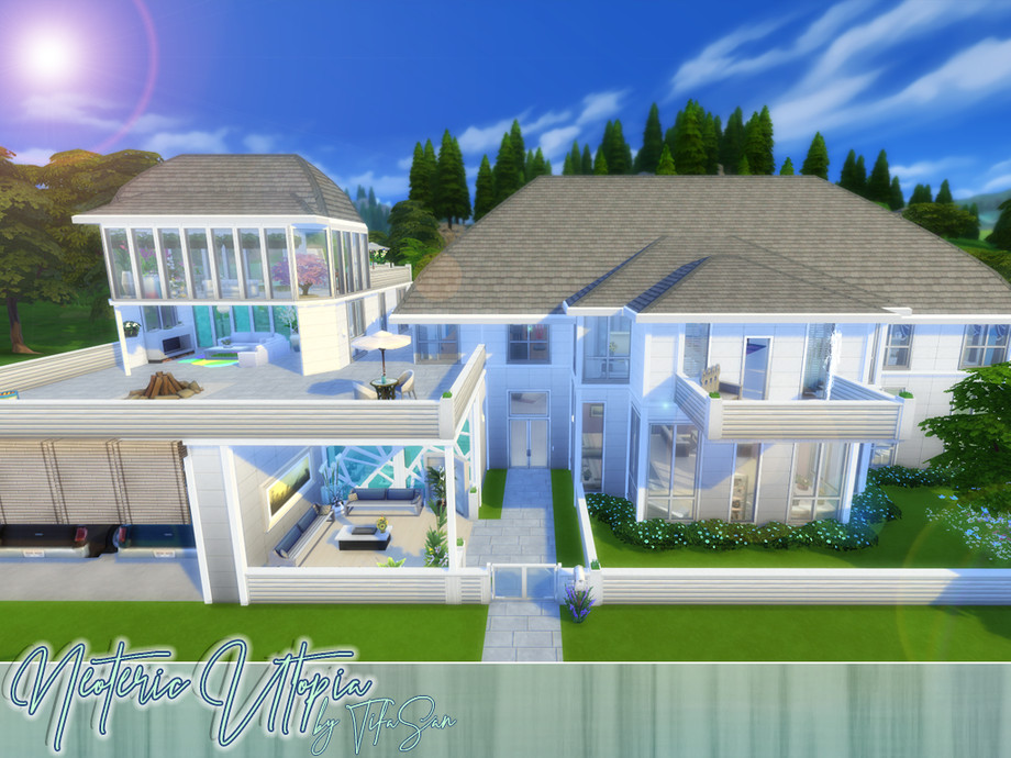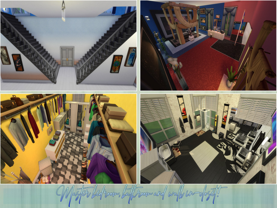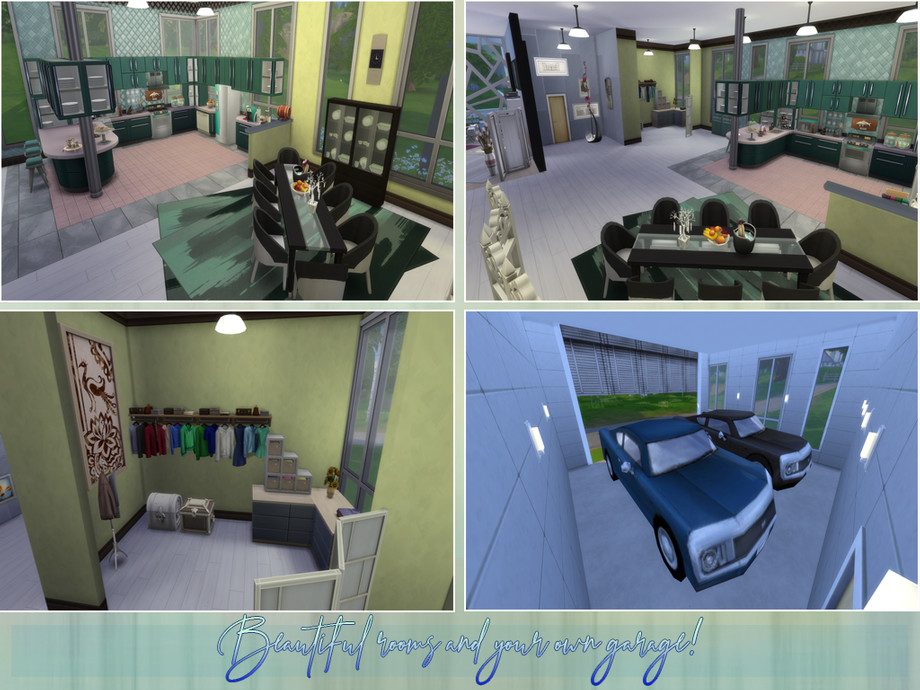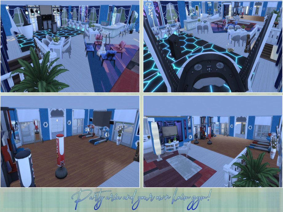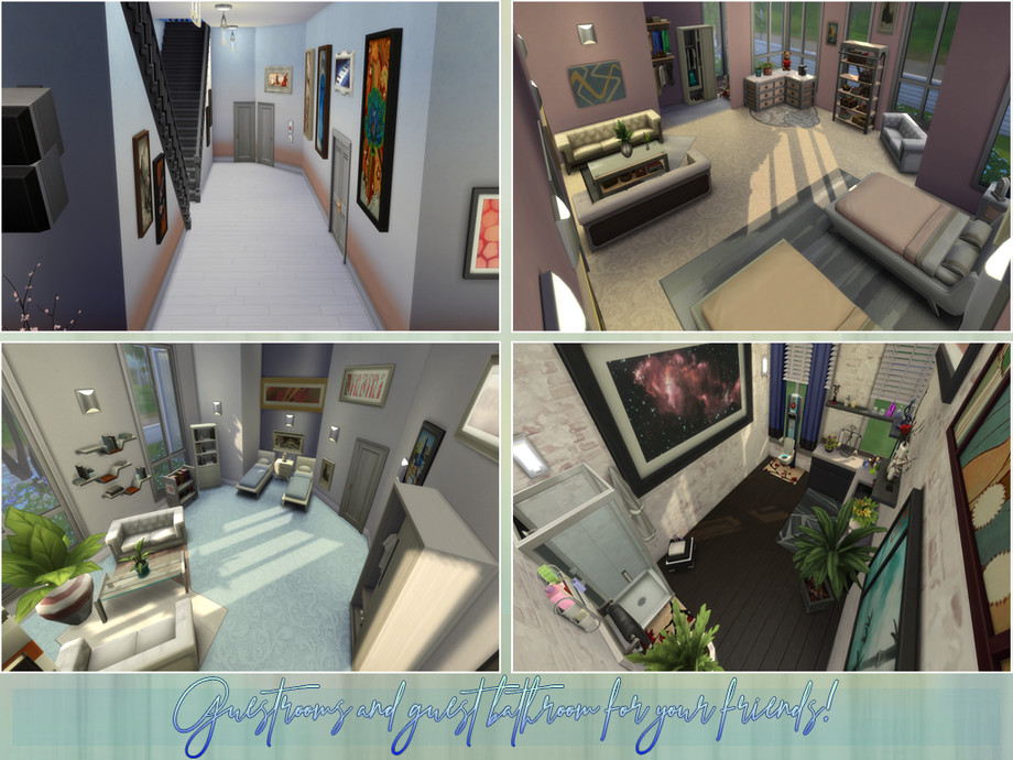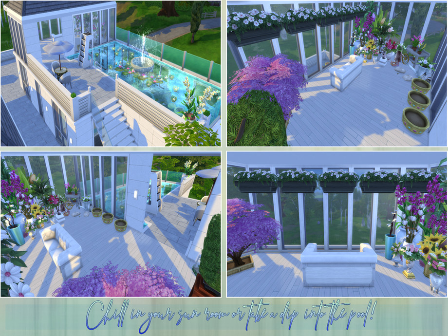 A modern home that includes 1 living room, 1 study, 1 master bedroom, 1 walk-in closet, 2 guest rooms, 3 bathrooms, a kitchen + dining area, a garage, a home gym, a bar + party area and a lounge. On the huge balcony, there is an area where you can bbq or just follow some fun activities like playing basketball! There is also a pool area, a sunroom (also called winter garden, where you can follow your passion for gardening!) and a pool house! The pool house comes with a bedroom and a small toilet. Right next to the garage, there's a small bungalow, if you just look to chill in front of your house and watch nature. (Or what other things that might pass by~). It's a great home and when your friends come over, they will always have a good time and a place to sleep. The guestrooms can easily be built into kids rooms if you look to expand your family! (Oh and..the master bedroom comes with a little surprise if you're looking for some exciting times with your partner! (I'm sure your sim will also enjoy the walk-in closet!)