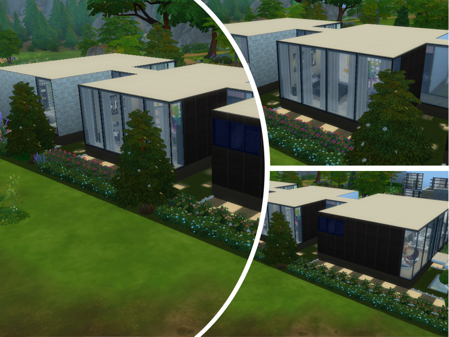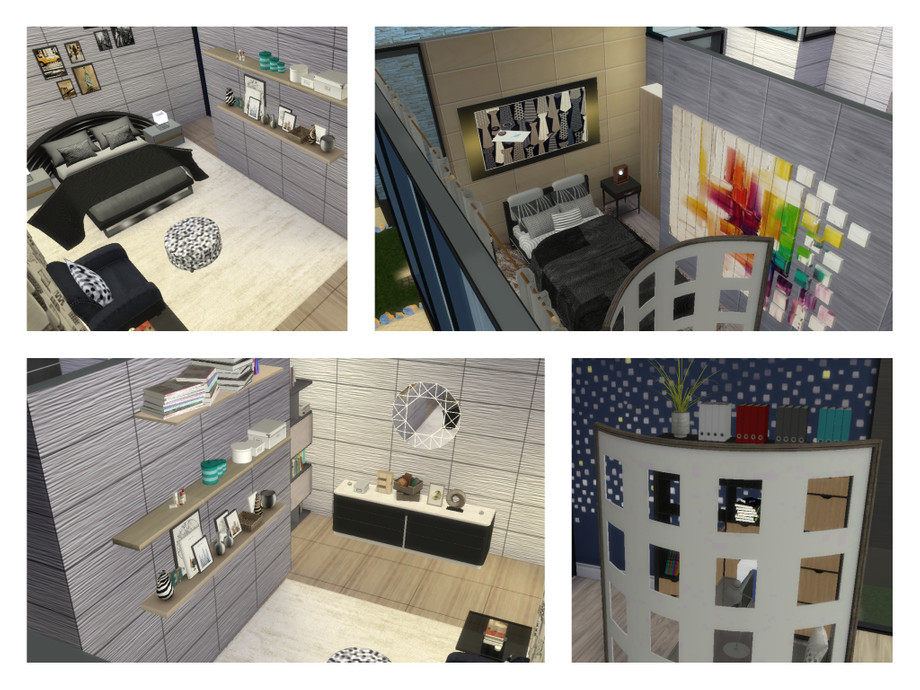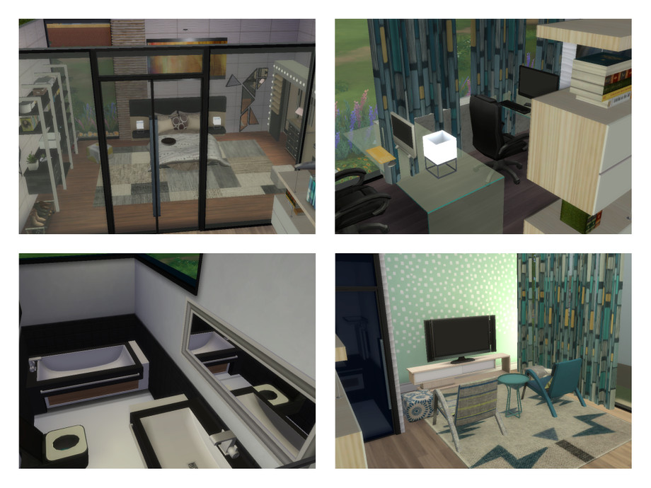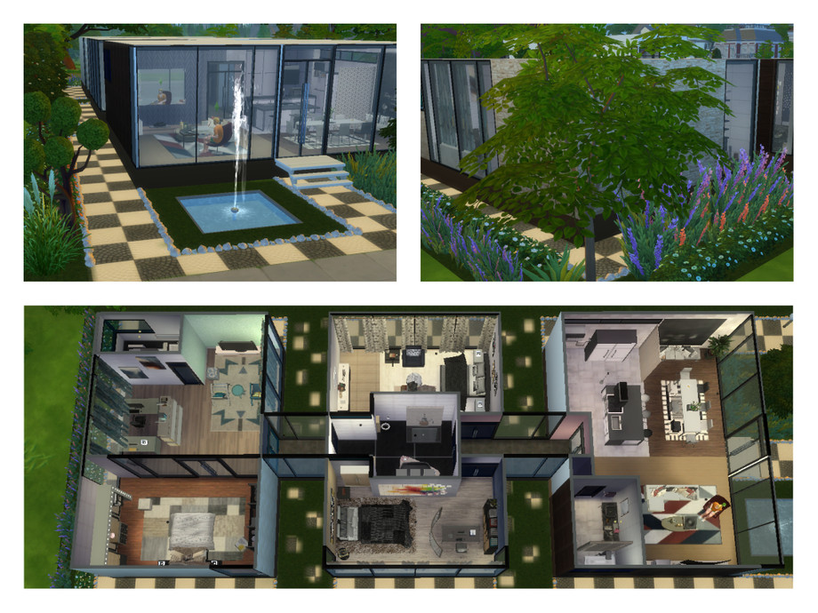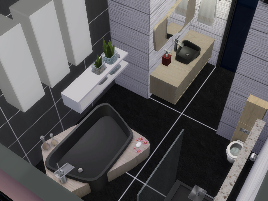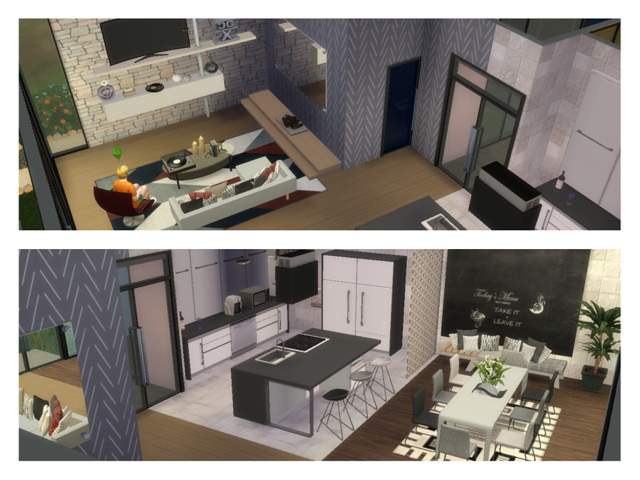 Another modern, house for your simmies :) 1 storey with a large kitchen, dining and living area, bathroom, 2 bedrooms with a shared bathroom. Master bedroom features an office area, living area and private bathroom.