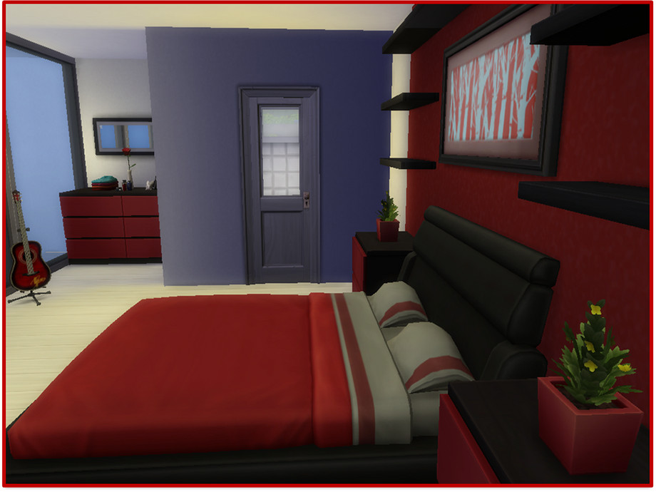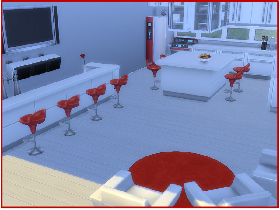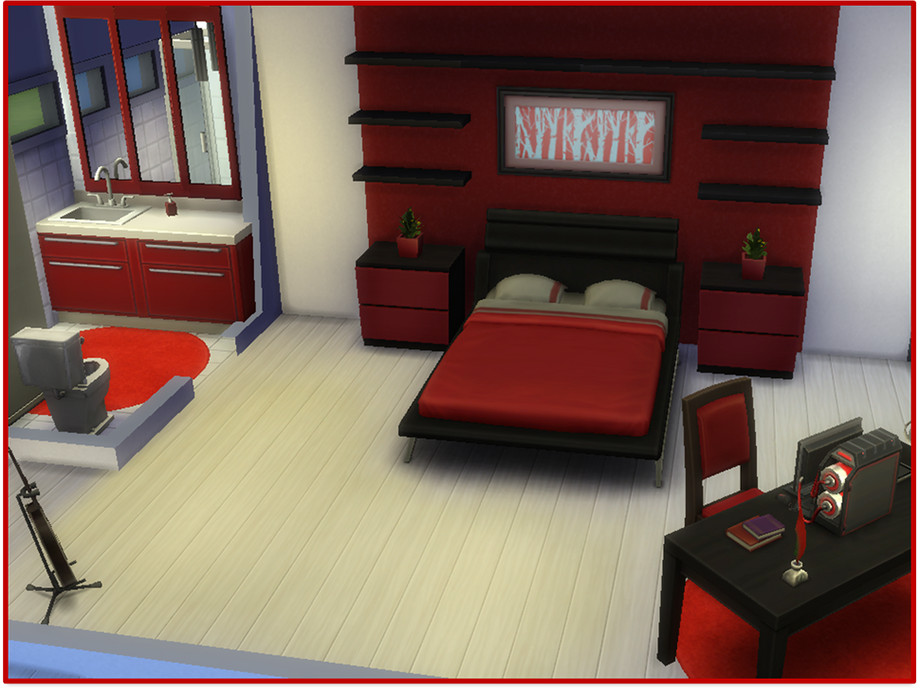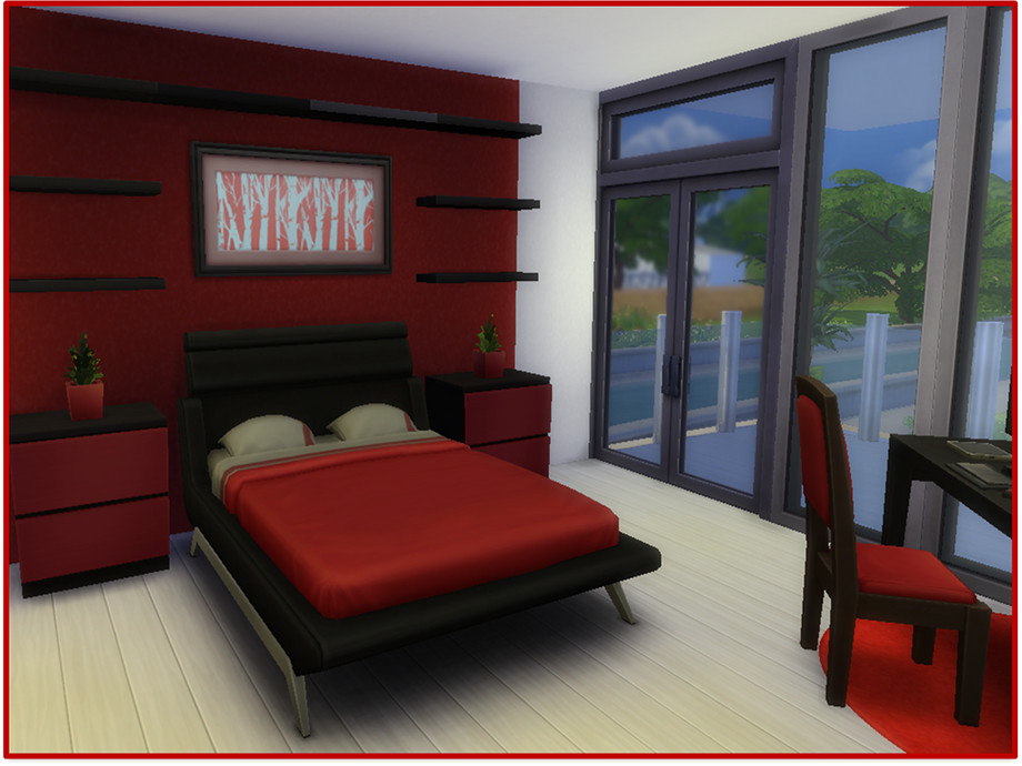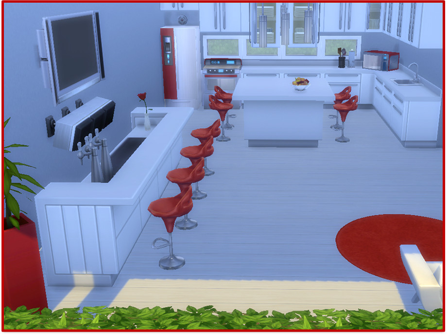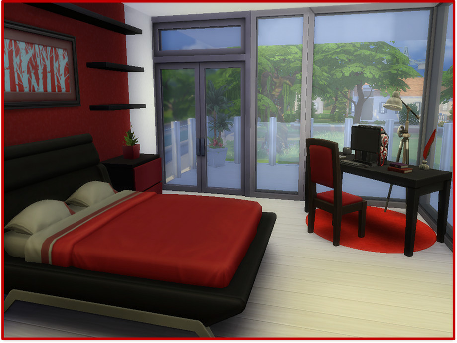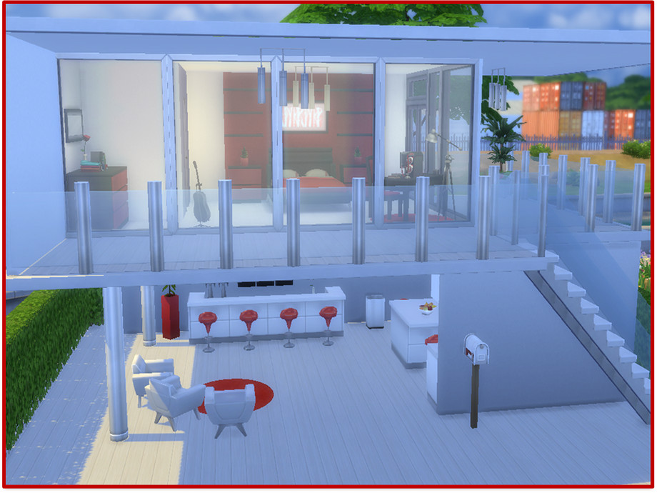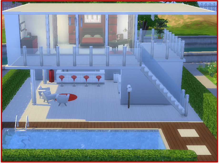 A superb modern architecture house to accommodate a successful Sim or a happy couple. Fully furnished and beautifully decorated in shades of red, black and white. A beautiful entrance with a swimming pool and an opened space with a gorgeous kitchen and a bar. Upstairs you have the master bedroom, with a study area, and a charming bathroom. Enjoy The Tiny Modern Hut by FS Design. CC free.