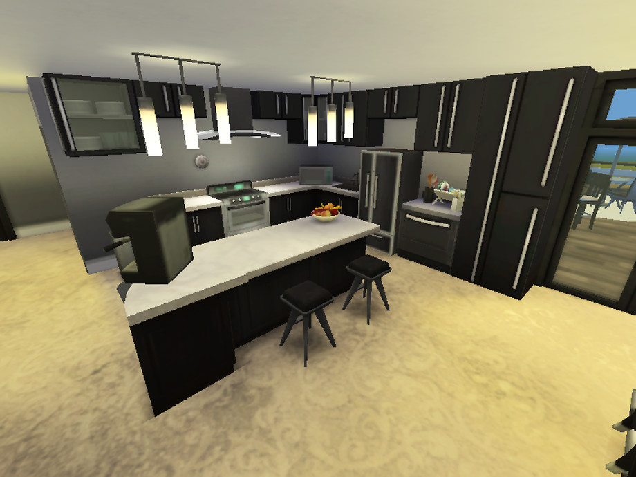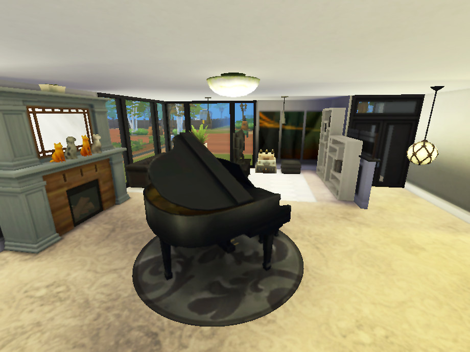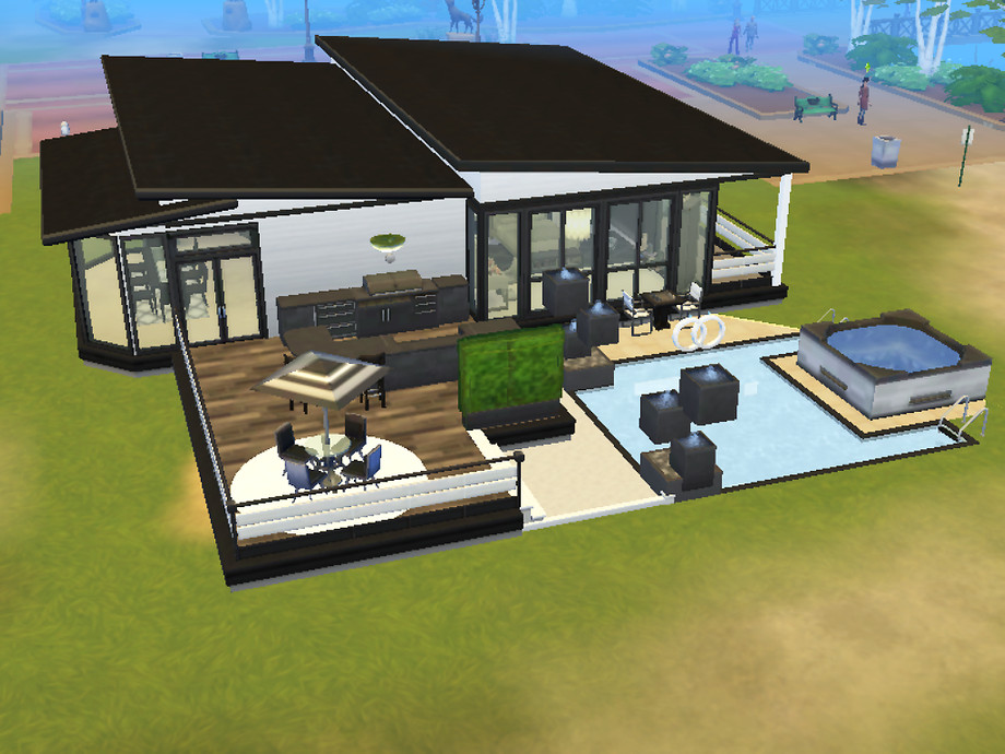 A mid-sized modern style home fit for a family of four. It features an open-concept main area and a Jack and Jill bathroom connecting the master and kid rooms.