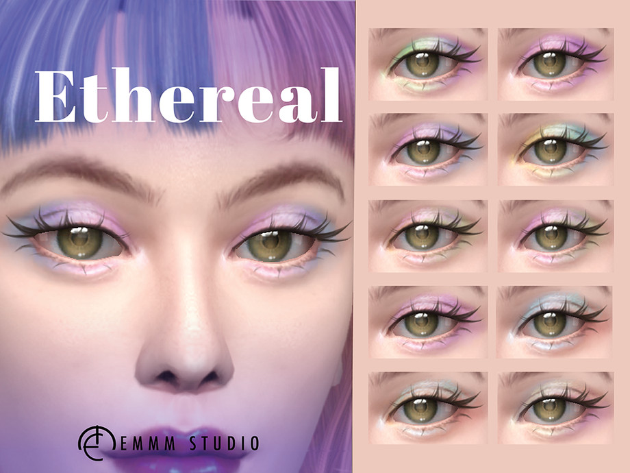 Ten ethereal eyeshadows in delicate pastel colours, each featuring a shimmering finish.