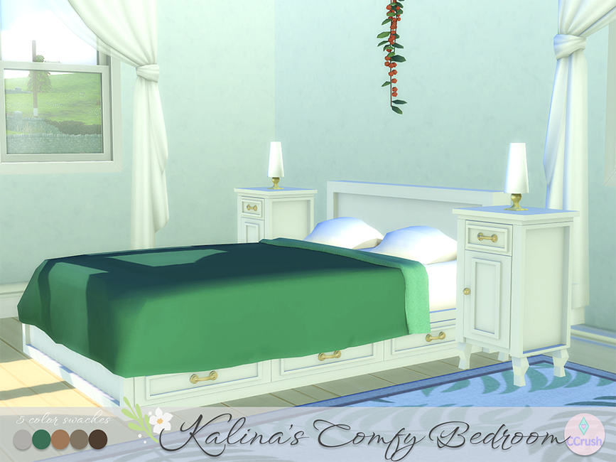Turn your Sims bedroom into the coziest spot in the house with Kalina's Comfy Bedroom set. This collection includes everything your Sims needs for a warm and stylish retreat: a comfy bed, nightstand, dresser, wardrobe, desk, pouf, wall cabinet, and even a hanging plant for that fresh touch of greenery. Designed with simplicity and comfort in mind, each piece blends perfectly together to create a space full of charm, warmth, and personality. Perfect for lazy mornings, cozy nights, and everything in between.