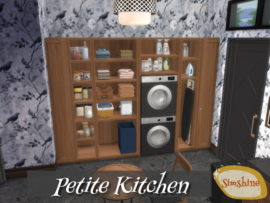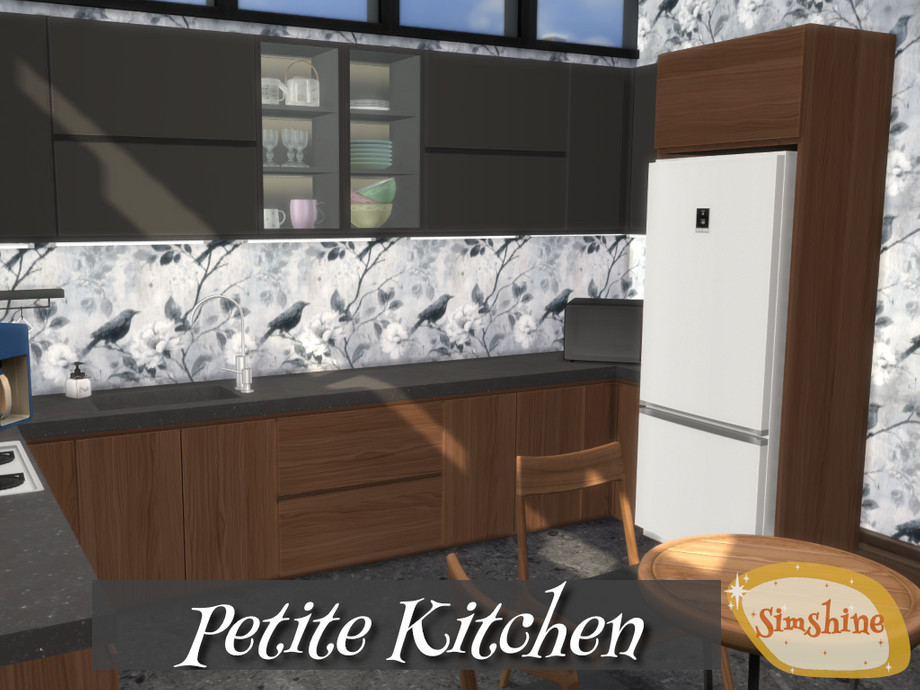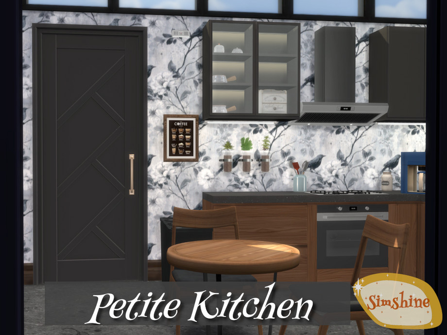 Sims 4 — Petite Kitchen by Sim_shine — Small kitchen in shades of black, gray, and dark wood. The custom content is TSR