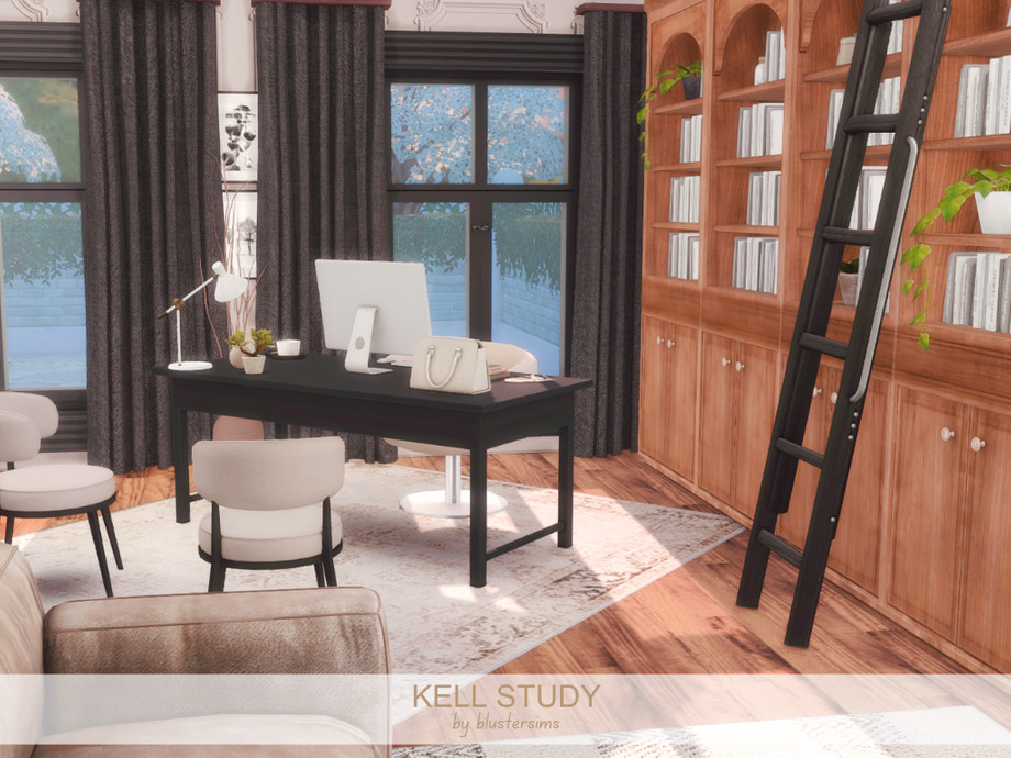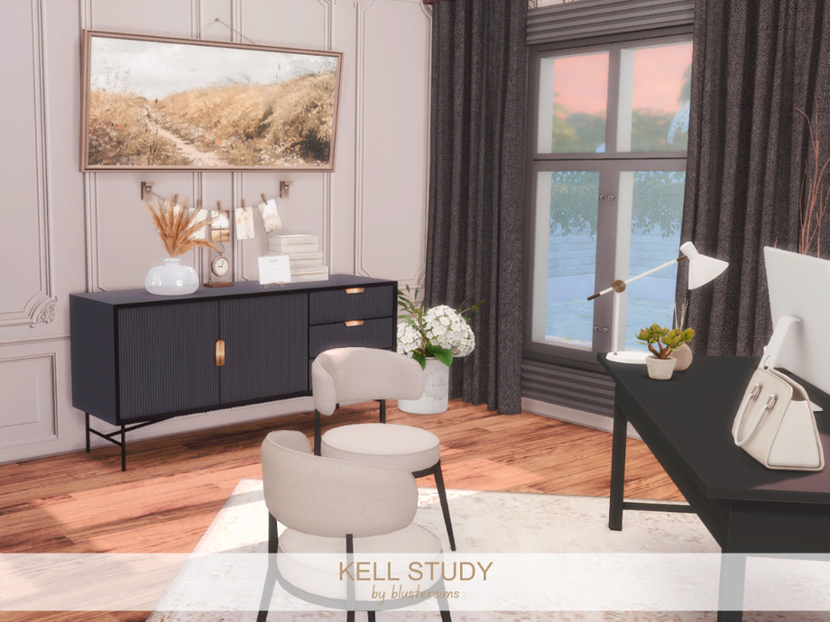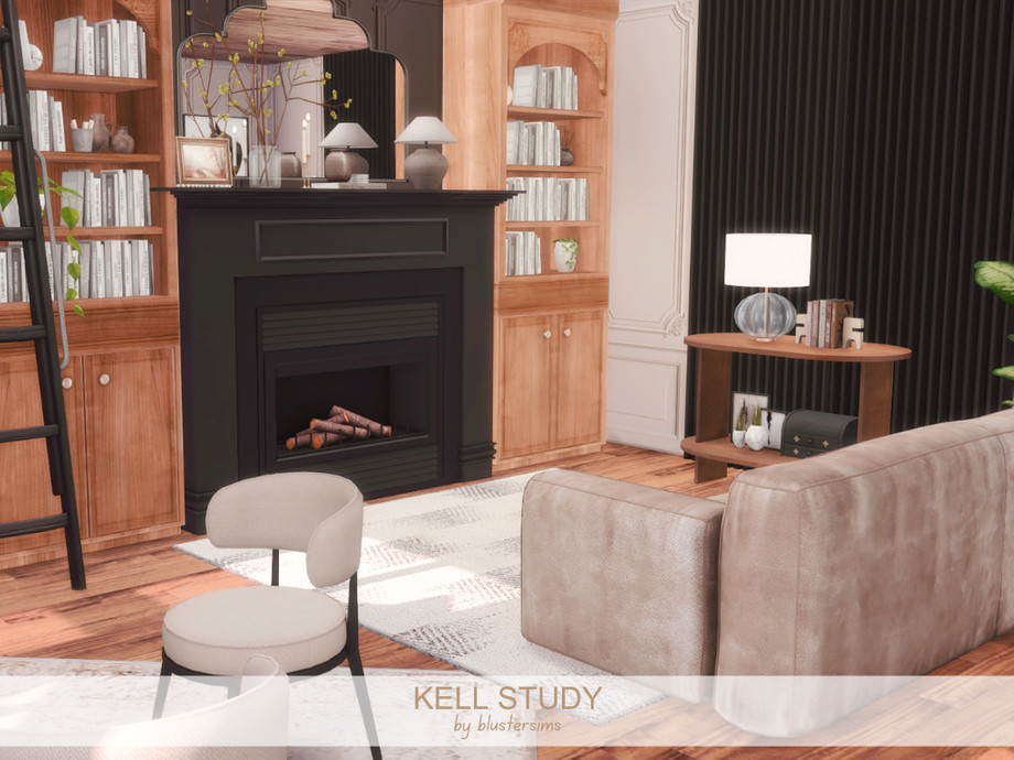 The Kell Study is a stylish, functional workspace that blends modern furniture with classic elements like built-in bookshelves and a fireplace, creating a warm and productive environment.
