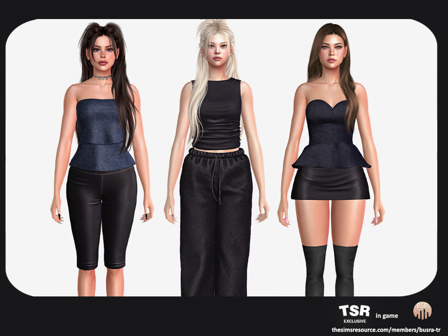 - Set Inclued : Top x3 - Jeans - Short - Skirt - 5 Swatches - For Female (Teen to Elder) - Custom Thumbnail - HQ Compatible - Original Mesh by busra-tr - All LODs Included - Base Game Compatible I hope you enjoy this creation!