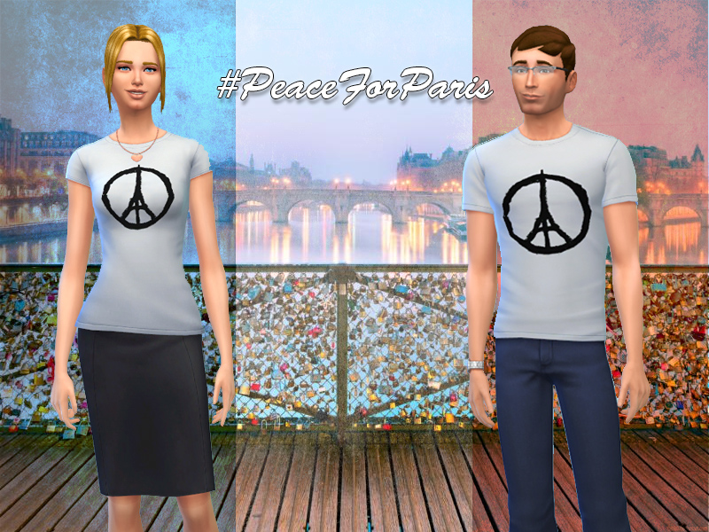 Shirt with the #PeaceForParis logo. This are white Shirts, for her and for him, with the black logo by Jean Jullien.