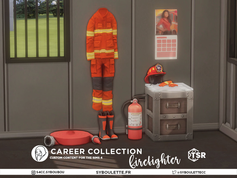 Get ready to spark some excitement in your Sims lives with the Firefighter Career Collection! This custom content set equips your Sim with a firefighter uniform to hang on the wall, complete with decor helmet, gloves, and boots. They will also have all the essential fire accessories at their fingertips, from extinguishers to rescue tools. Whether they're bravely battling blazes or racing to the rescue, your Sim will be prepared for action anytime, anywhere! It's time to turn up the heat and let your Sims live their hero dreams!