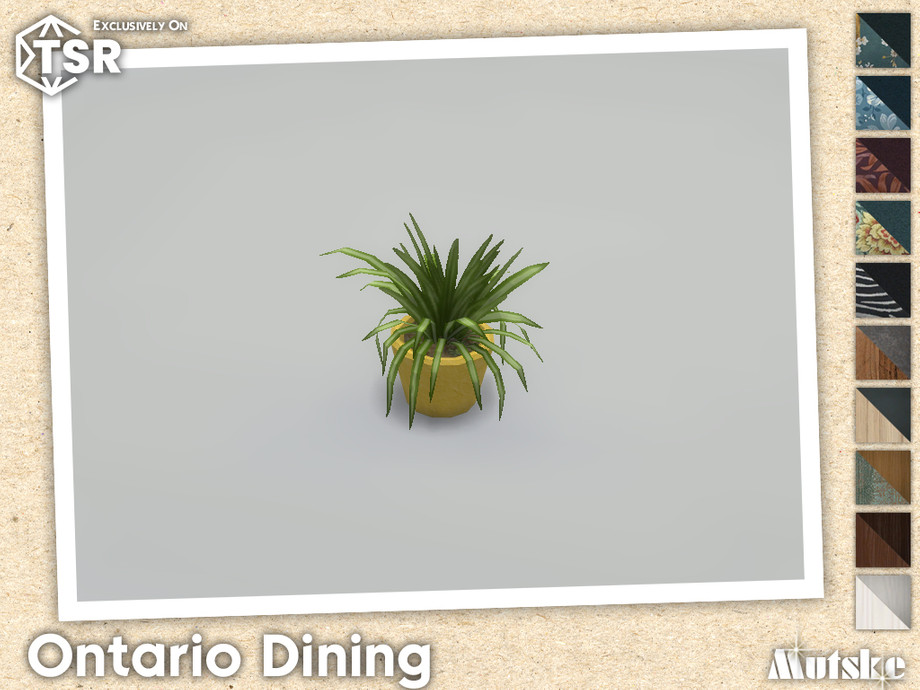 Ontario Diningroom set with seating, surface and more, some have slots to put clutter on. Make sure that your game is fully patched and up to date for this set to show and work correctly in the game. Have fun playing!