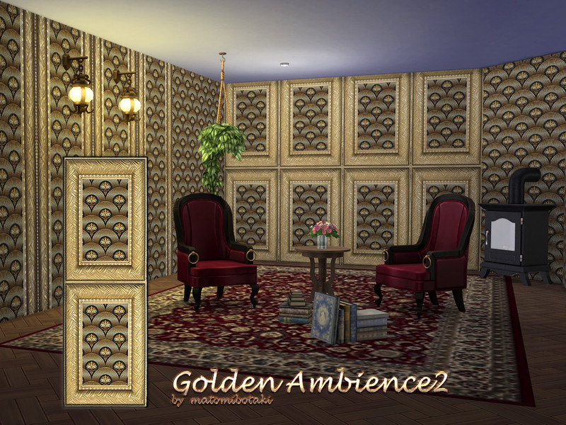 Elegant wallpaper with golden elements, classically chic and stylish, in 3 different variations and 3 wall heights, each item with custom thumbnail, created for Sims 4 by matomibotaki.