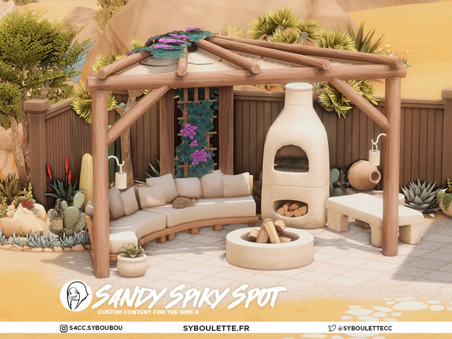 Sandy Spiky Spot is a Mediterranean-inspired landscaping set made to bring the warmth and charm of dry gardens into your Sims world. Fill your outdoor space with lush succulents, striking cacti, small trees, terracotta pots, and natural stone details to create a serene, sun-soaked retreat.