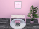 This set has a desk, chair, wall art, laptop, lamp, pen holder, & a plant.