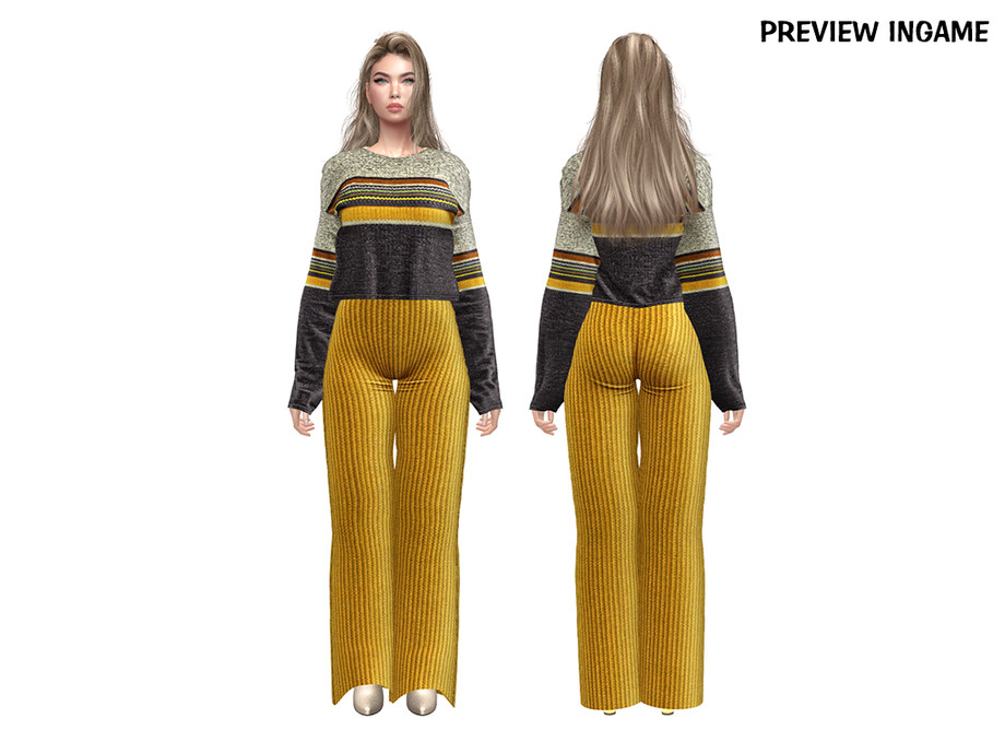 A cozy knitted outfit set featuring a color block long sleeve sweater and ribbed wide leg pants. Designed with textured knit fabrics and a relaxed silhouette, this set is perfect for casual, everyday, and autumn winter Sims outfits.