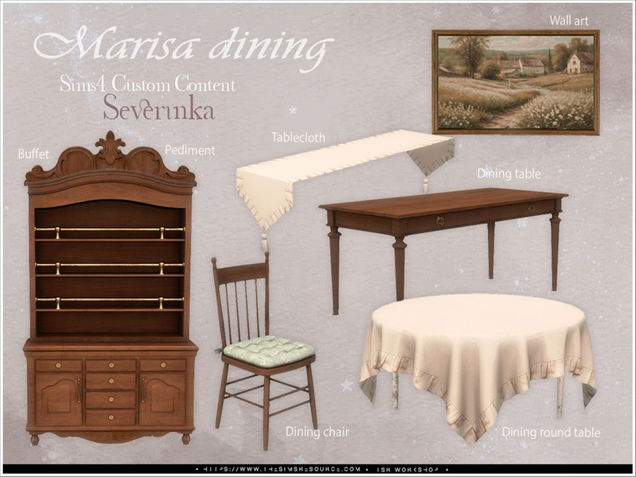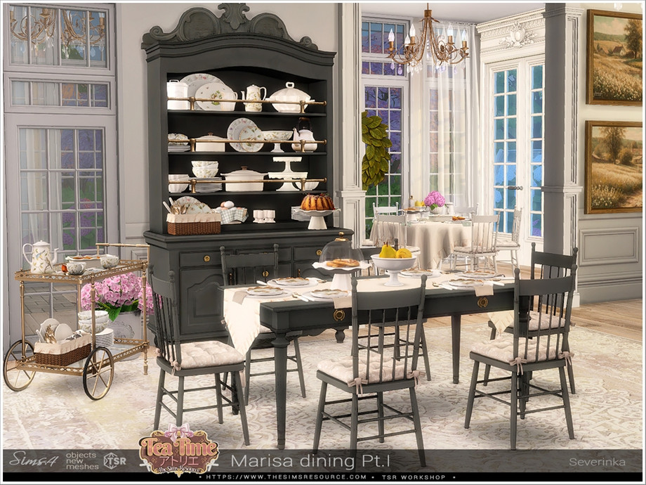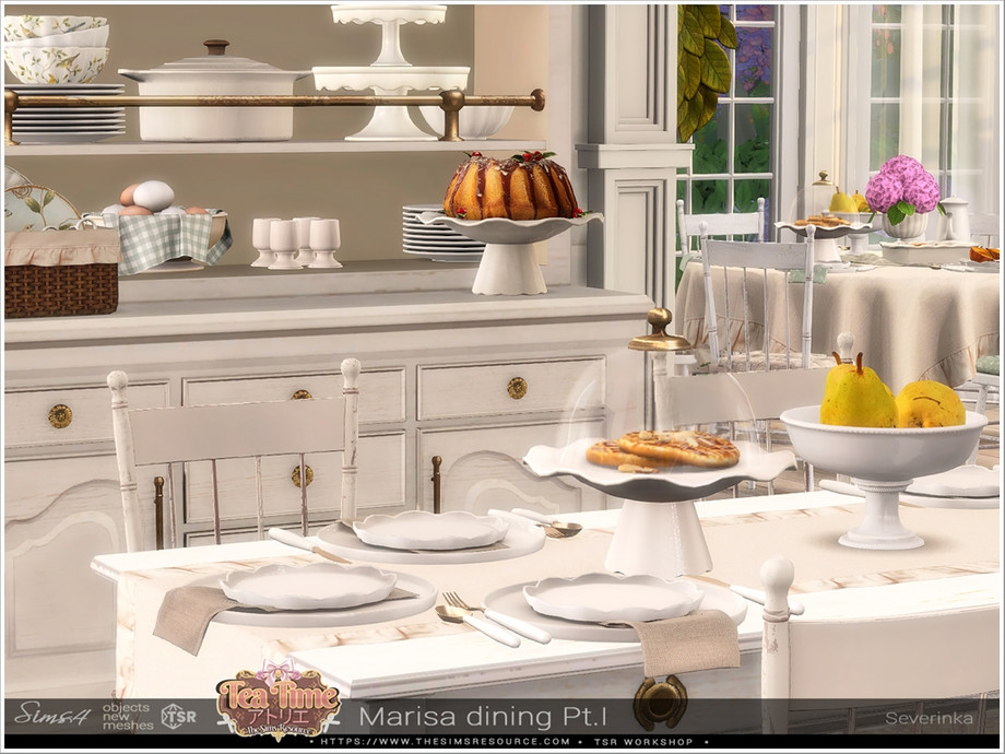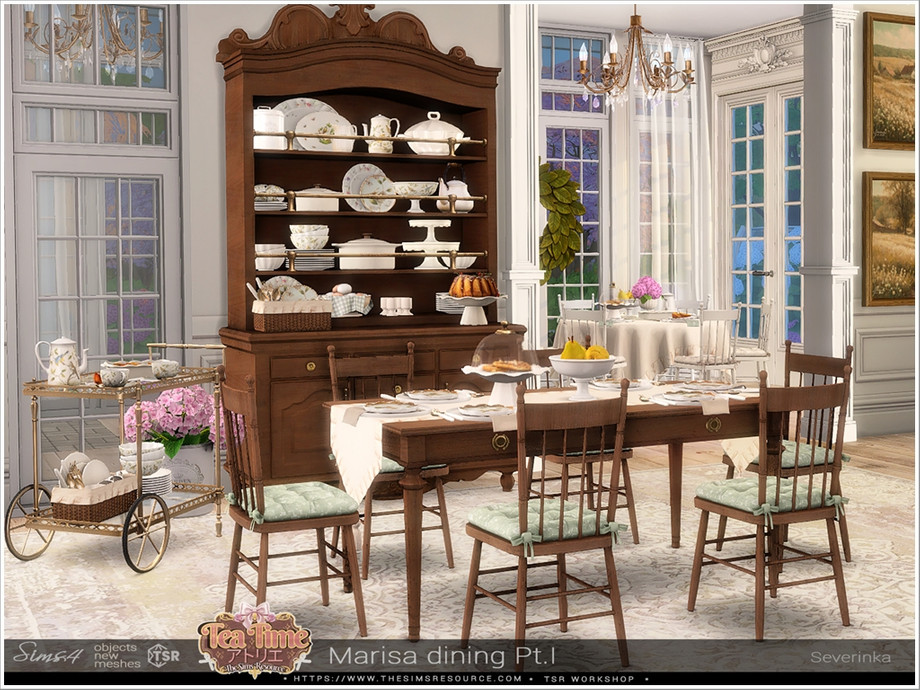 Delicate beige and deep shades of green combined with natural wood and aged gold will fit perfectly into the Farmhouse, Shabby, French Country or Vintage styles. Part 1 - 7 items: Buffet, dining table, dining table round, dining chair, wall art, wall wood pediment, tablecloth. Part 2 - 7 items: Casserole big, casserole small, decorative plates, decorative plates oval, stacks of plates, vase for fruits, basket with dishes. Part 3 - 8 items: Bowl, bowls, teapot, egg stands, tea pair empty, cups on plates, 2 vase for cakes. Part 4 - 8 items: Serving trolley, cloche, tea pair full, baking pears, baking pears for plate, pears, tableware, cultery.