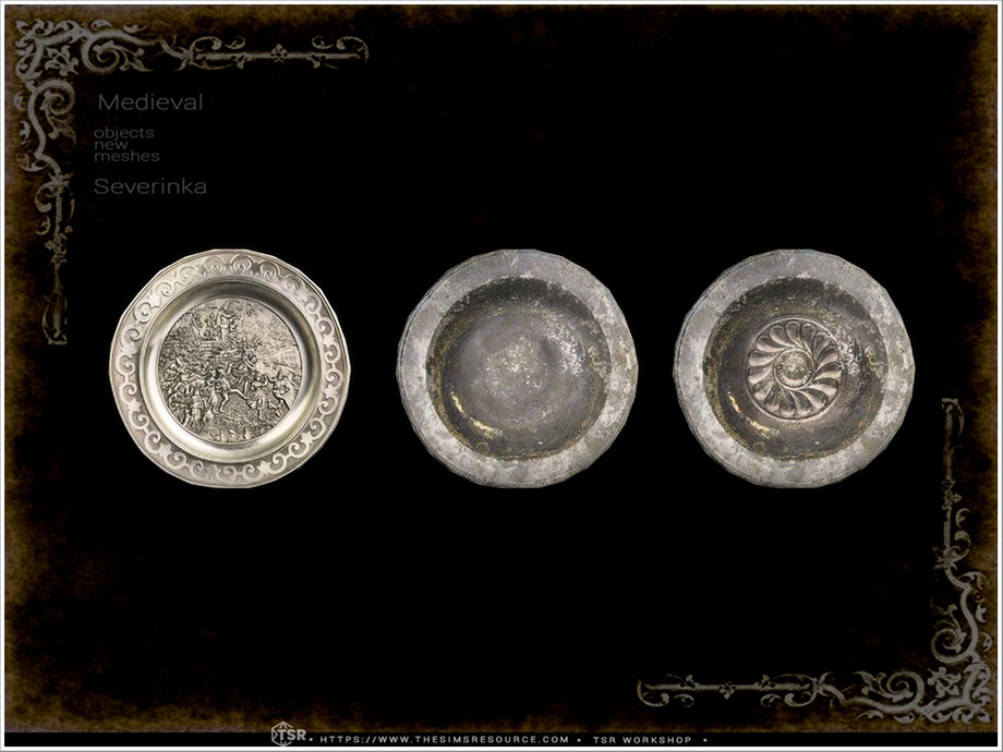 Dining table, dining chair, backless stool, candeliers with candles (for medium and high walls), torch with flame, wooden bowls, wooden mug.
