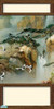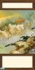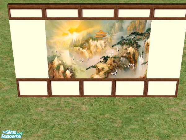 The set includes a 3-panel mural created from a oriental painting, set on cream colored poured walls enclosed in dark wood beams, and a plain cream colored wall with dark wood.