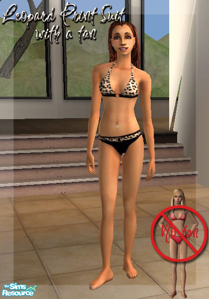 Does your sim swim and sun by the pool, but still suffer from pale skin? Now a new revolutionary swimsuit will provide your sim with a great tan while wearing a stunning swimsuit! This suit is a lovely leopard print & black combination and provids a subtle tan on pale or lightly tanned skin tones.