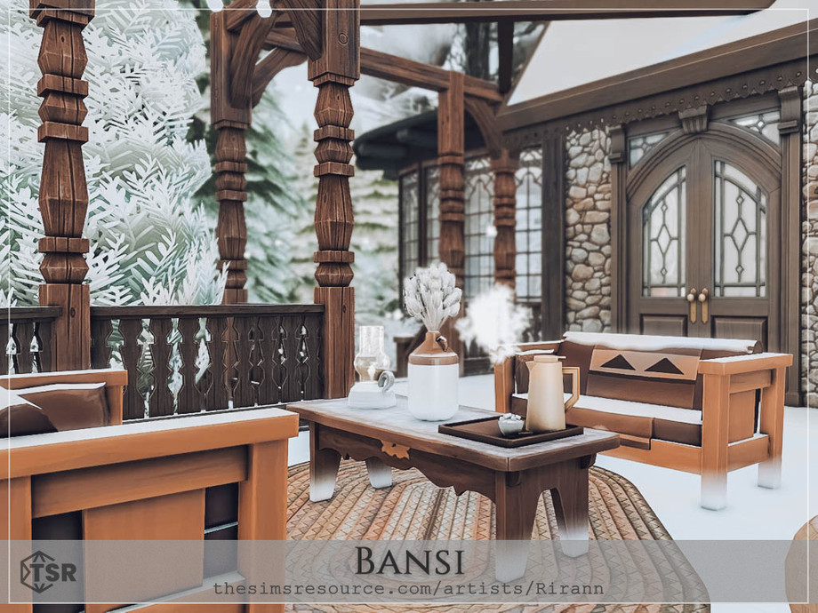 Bansi is a cozy winter home in brown and green colors with the use of wood and stone textures. The house has a patio on the outside