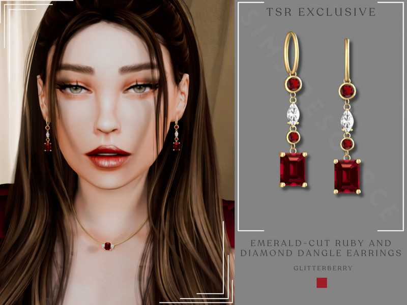 A gold dangle earring with emerald cut ruby