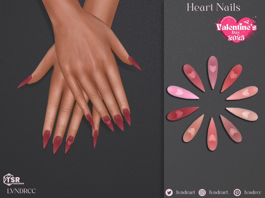 Medium length nails with a trendy blush ombre detail and a heart impression, in a variety of romantic pink, neutral and red shades.