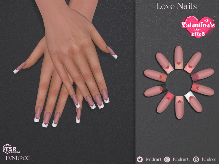 Square manicure with a painted heart detail in French style. In Various shades of pink, red and neutral colours, perfect for a date.