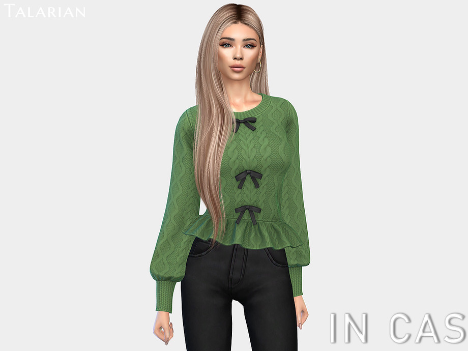 Fitted cable-knit sweater featuring a soft peplum hem, voluminous sleeves with tapered cuffs, and three decorative front bows. The textured knit and feminine silhouette make it a versatile piece for both casual and dressed-up looks.