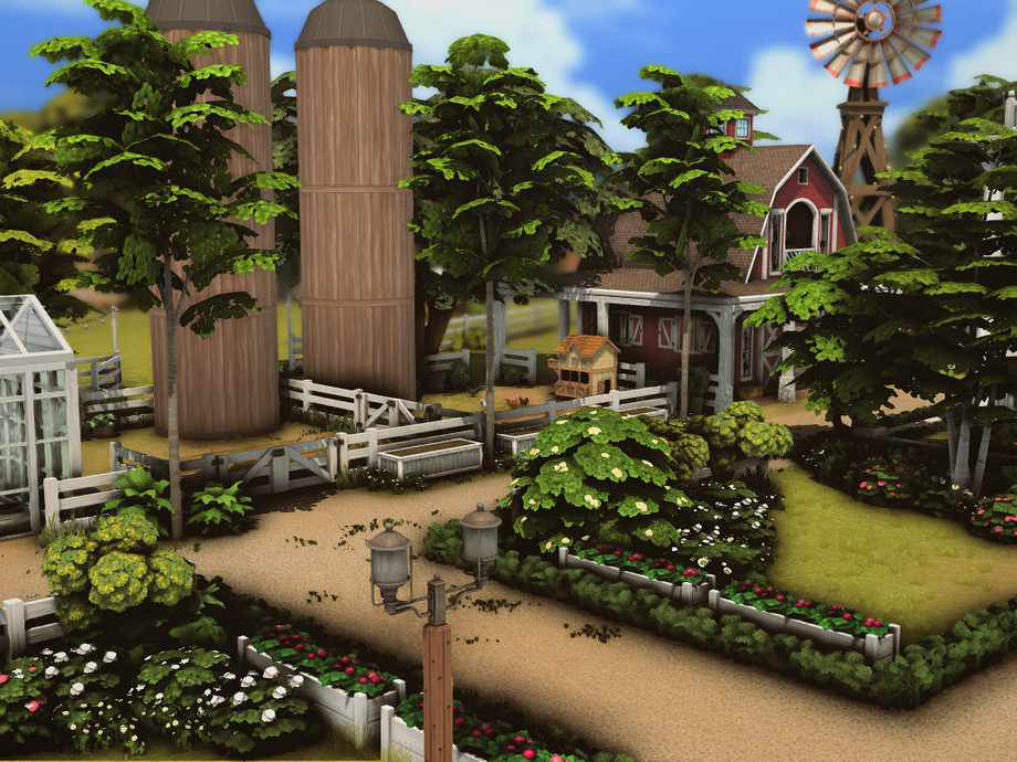 In the background, barns, silos, and a windmill reinforce the property's functional, countryside atmosphere.