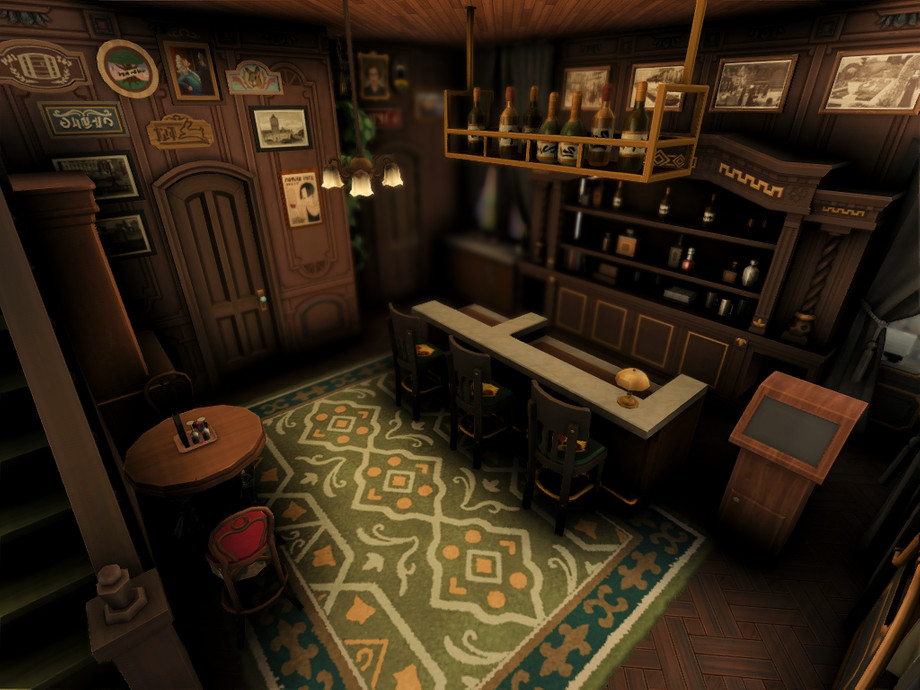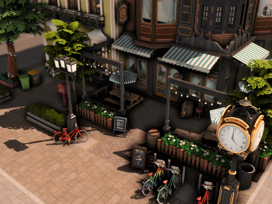 An elegant residential building with European architecture, featuring wrought-iron balconies. Its pastel-toned facade reflects the classic style. On the side, an entrance leads to a cozy little pub, where the warm yellow light and the scent of aged wood welcome visitors. The soft murmur of conversations and live music echoes along the sidewalk, blending into the daily life of the residents. Between the tranquility of home and the vibrancy of the pub, the building becomes a perfect gathering spot for urban life.