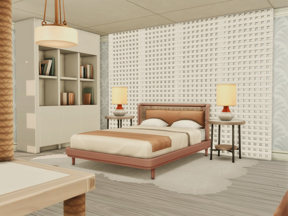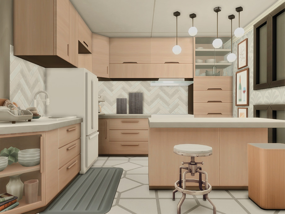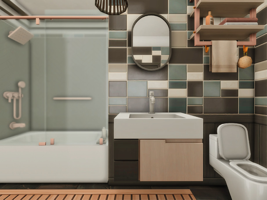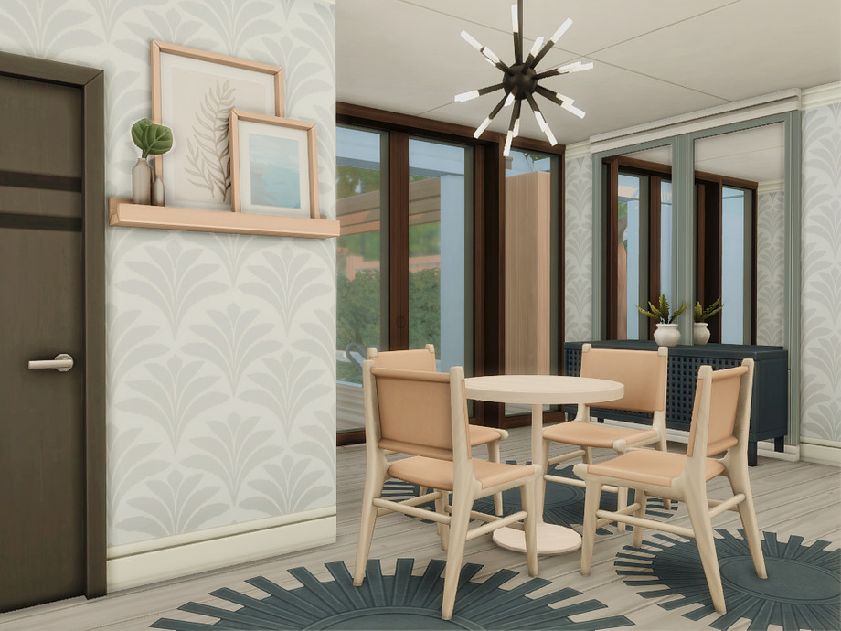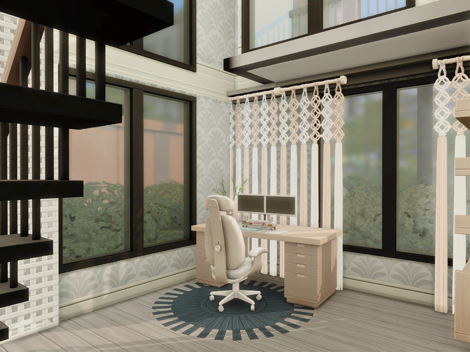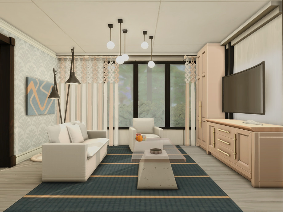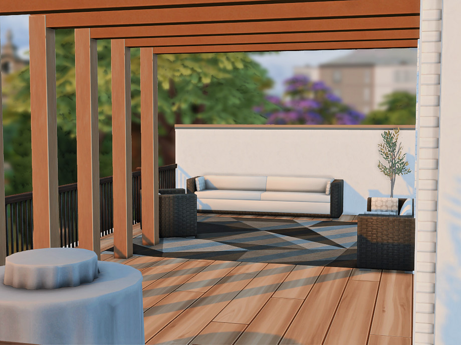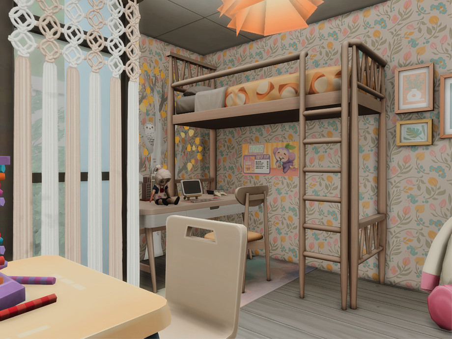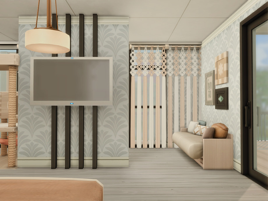 A modern two-bedroom family home designed for comfortable everyday living. The house features a main bedroom for adults, a second bedroom, one bathroom, and a functional basement space. An open, light-filled layout connects indoor and outdoor areas, while dedicated space for a cat makes it perfect for pet-loving Sims. Clean lines, warm wood accents, and multiple terraces create a relaxed, contemporary atmosphere ideal for small families and storytelling gameplay.