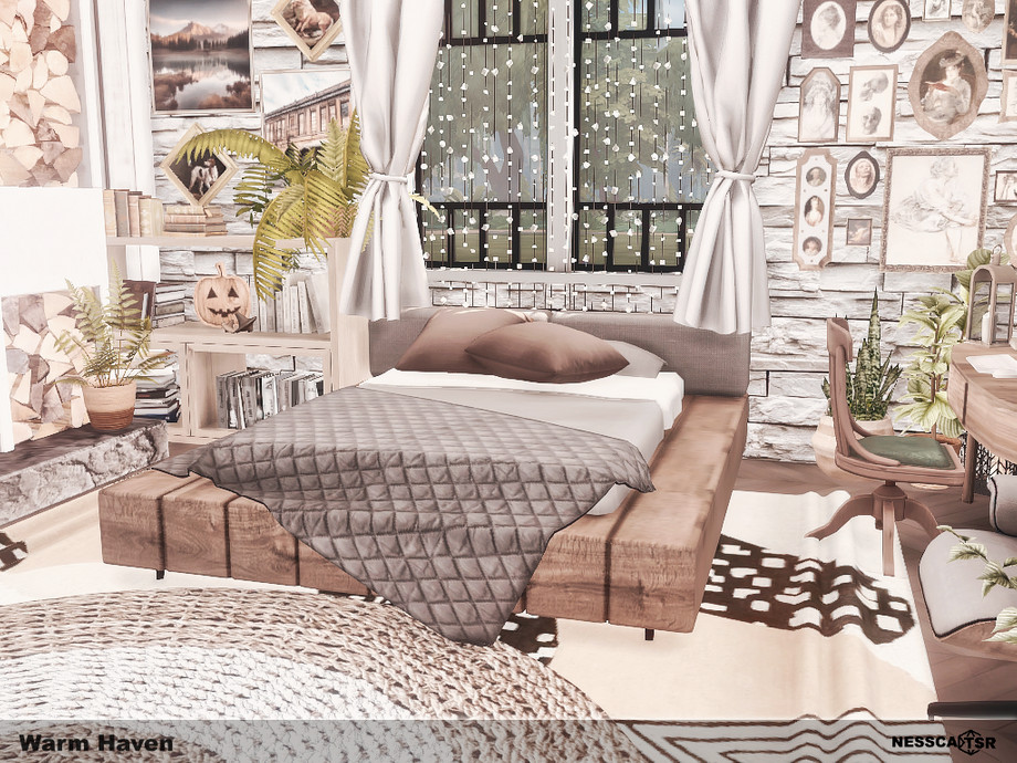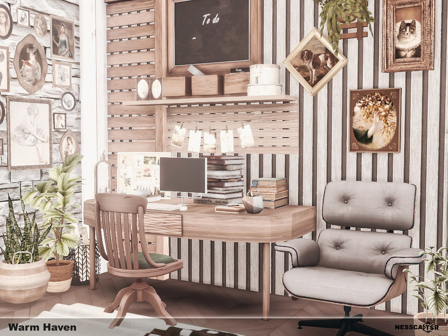 Warm Haven is a very cozy bedroom with a computer station and relaxation area. Natural wood finishes with green accents create a warm atmosphere. Enjoy!