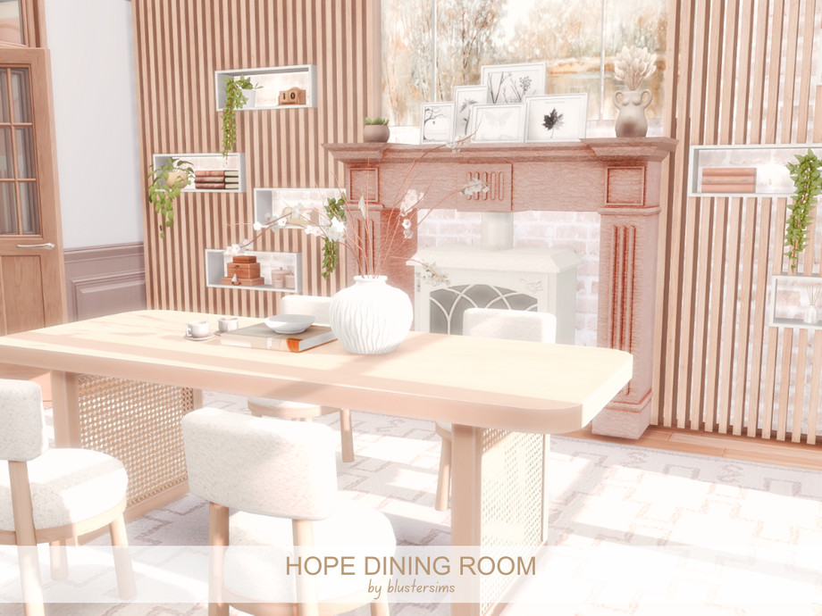 The Hope Dining Room is a bright, welcoming space featuring a cozy fireplace and a table set for four Sims. Soft tones and light wood finishes create a warm, airy atmosphere, enhanced by plenty of natural light that fills the room throughout the day.