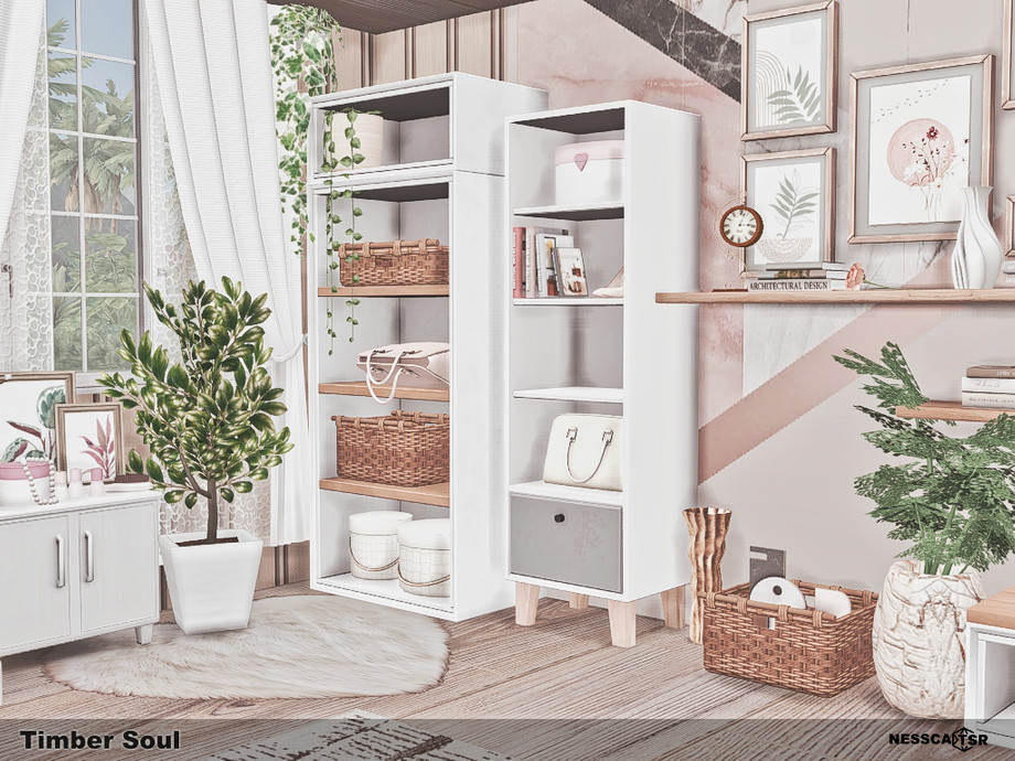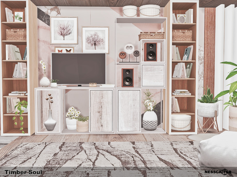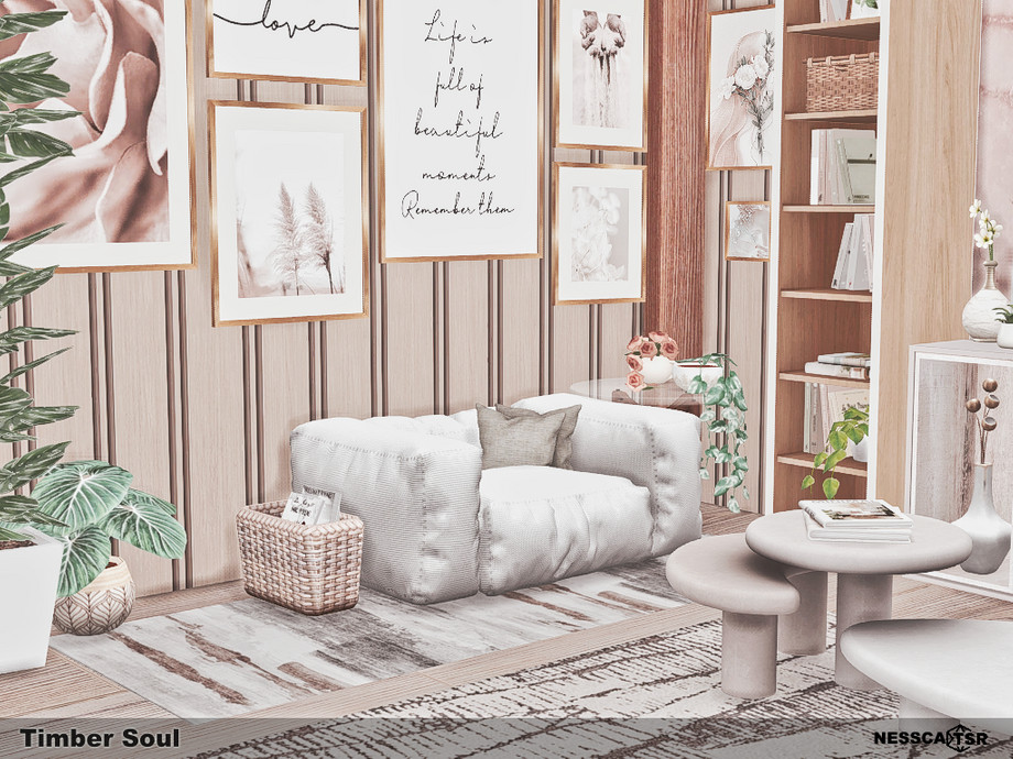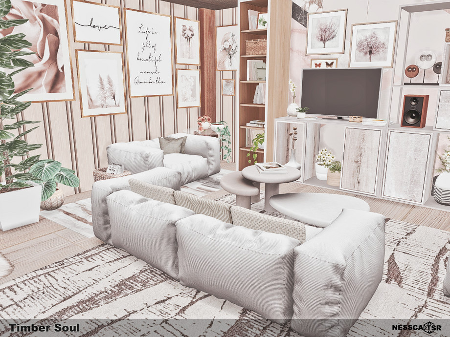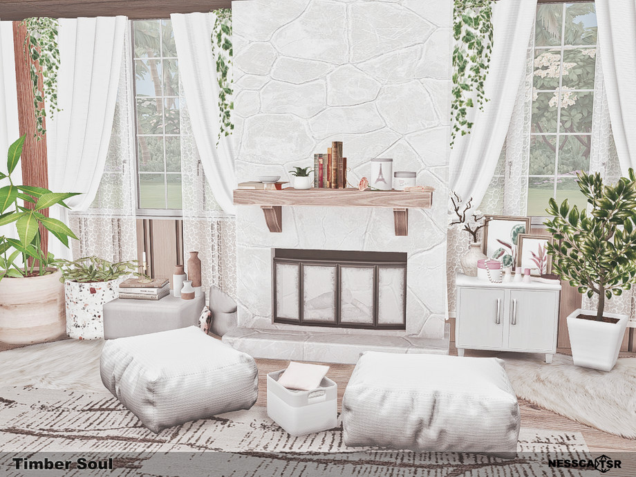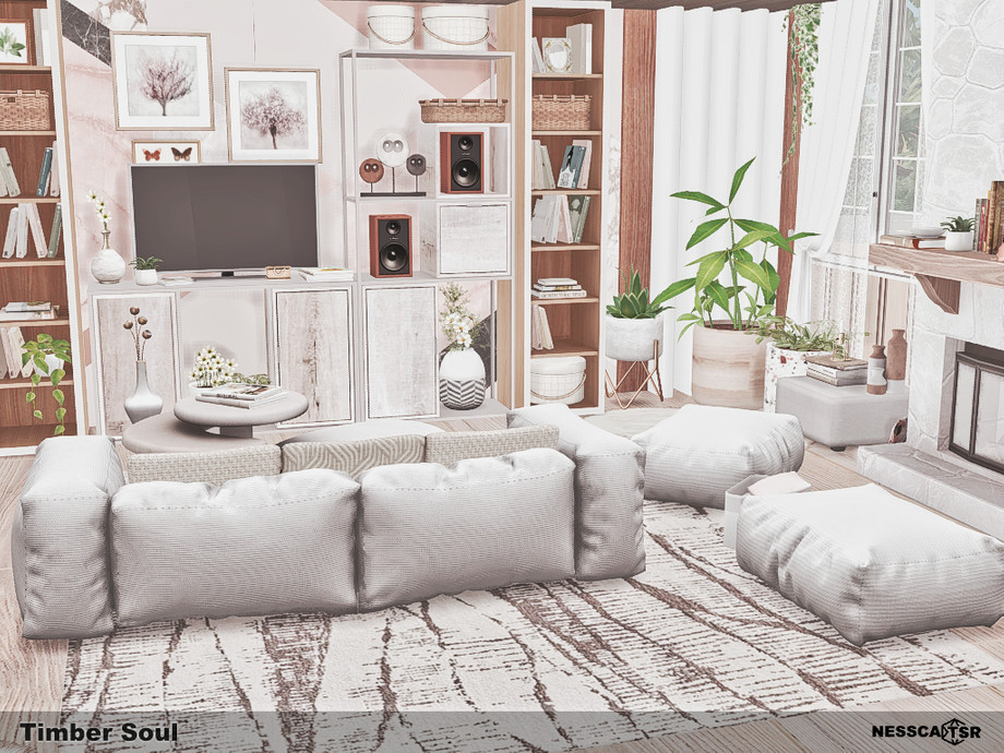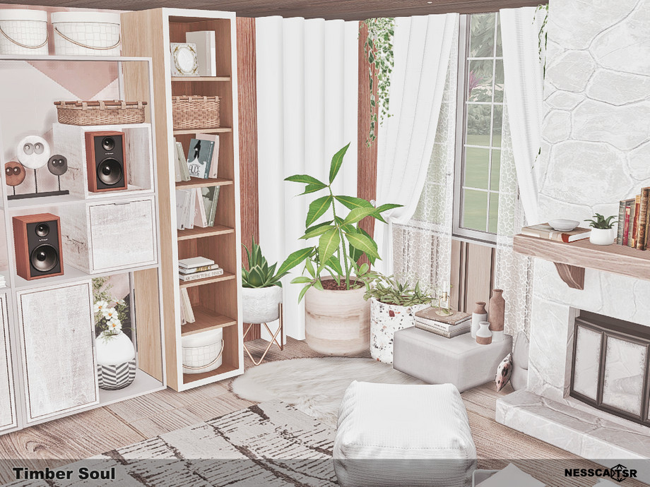 Timber Soul is a charming, bright living room. It features numerous placs to sit and relax for your sims along with a fireplace TV, and bookshelves. Have fun!