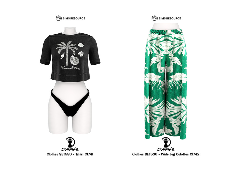 A relaxed and stylish outfit set featuring a graphic crop t-shirt paired with flowy wide leg culottes. Designed for effortless everyday wear, this set combines comfort with modern street style for The Sims 4. The lightweight culottes with bold tropical patterns add movement and personality, while the cropped tee keeps the look minimal and trendy. Perfect for city walks, casual outfits, summer days, and laid-back fashion aesthetics. Tshirt C1741 Wide Leg Culottes C1742 8 Swatches Compatible with HQ mod Works with all of skins Custom Thumbnail New Mesh All Lods All Maps Teen to Elder For; Female -I don't answer WCIF -Not available with hat
