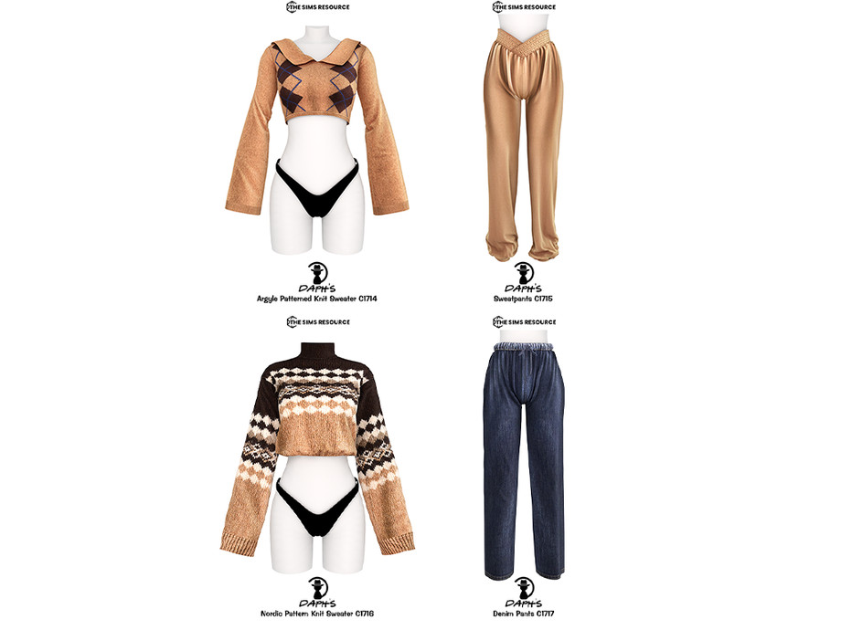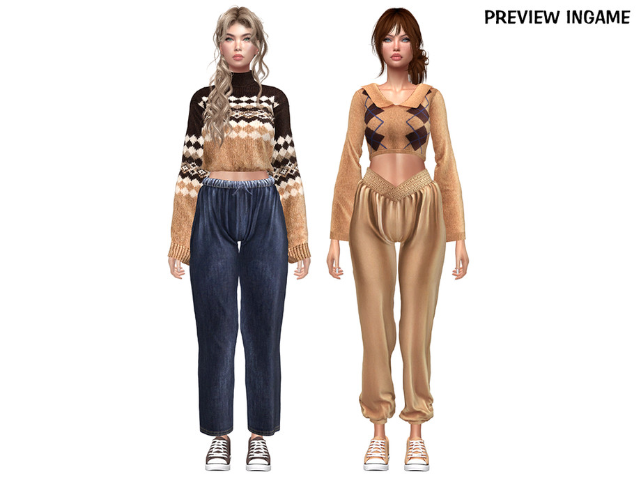 Featuring 2 complete looks - 4 individual pieces, this set blends soft knit tops with relaxed-fit pants for a modern, off-duty Sims aesthetic. Warm earth tones, comfortable silhouettes, and subtle knit details make these pieces perfect for casual gameplay and urban-inspired outfits.