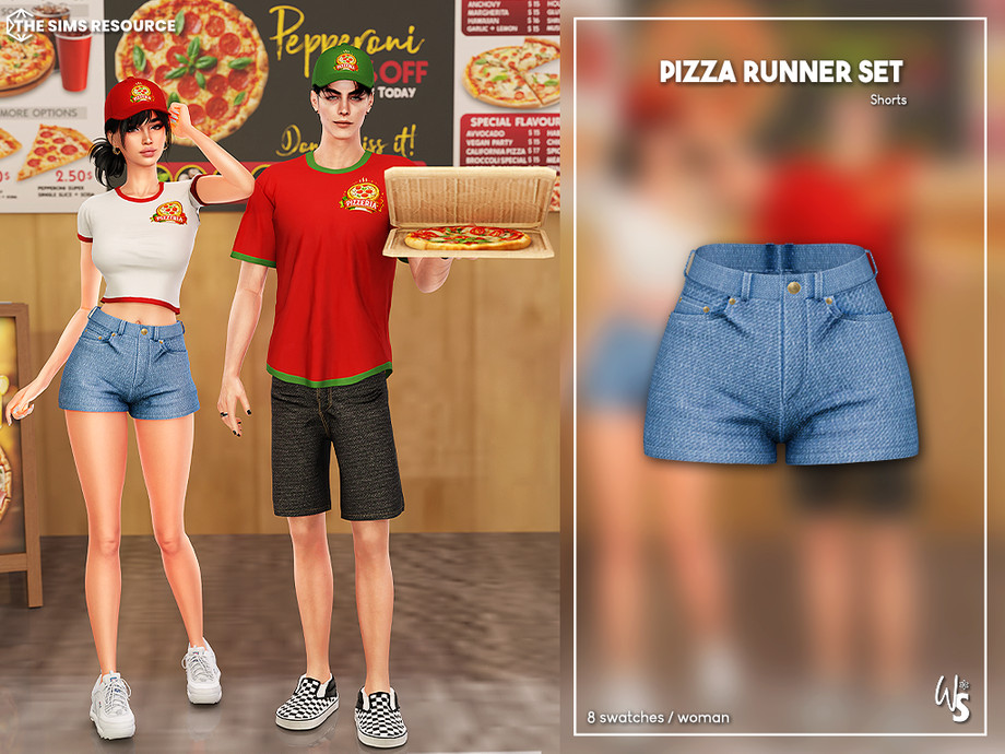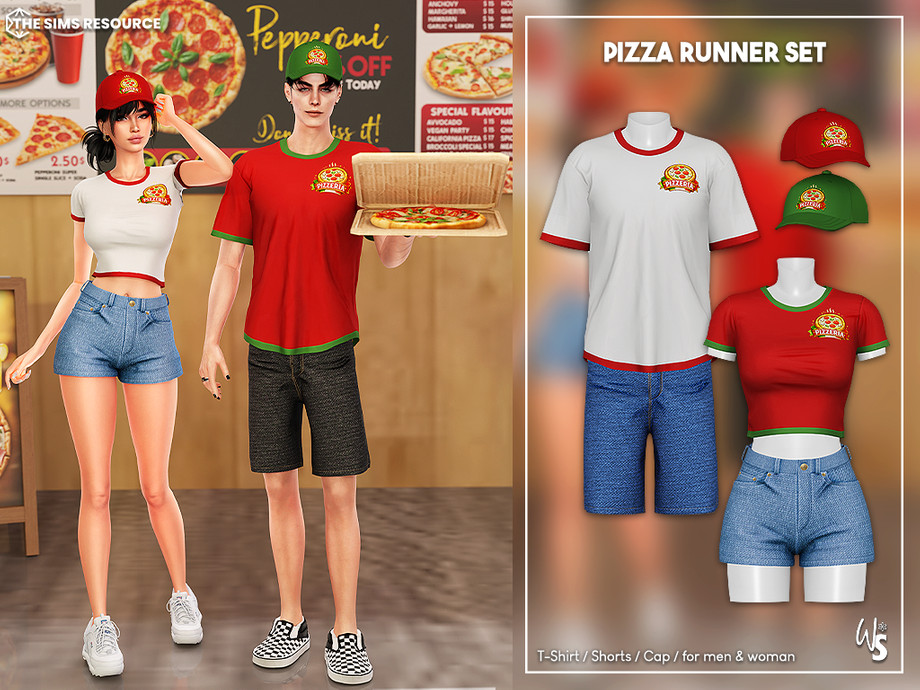 Designed for both male & female Sims, this outfit is perfect for pizzerias, fast food restaurants, or urban casual gameplay.