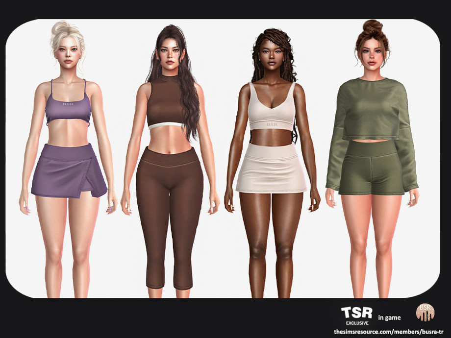 - Set Inclued : Top x4 - Short - Legging - Skort - Short - Skirt - 5 Swatches - For Female (Teen to Elder) - Custom Thumbnail - HQ Compatible - Original Mesh by busra-tr - All LODs Included - Base Game Compatible I hope you enjoy this creation!