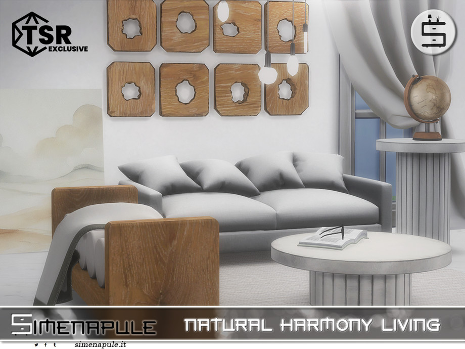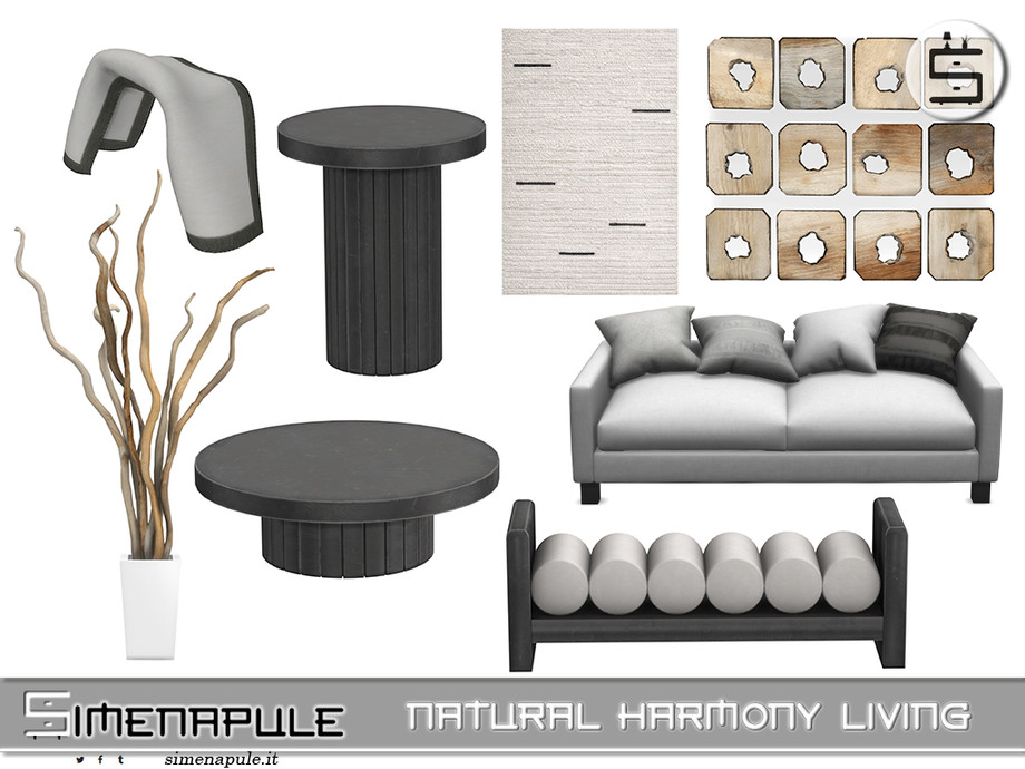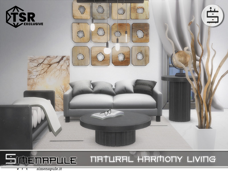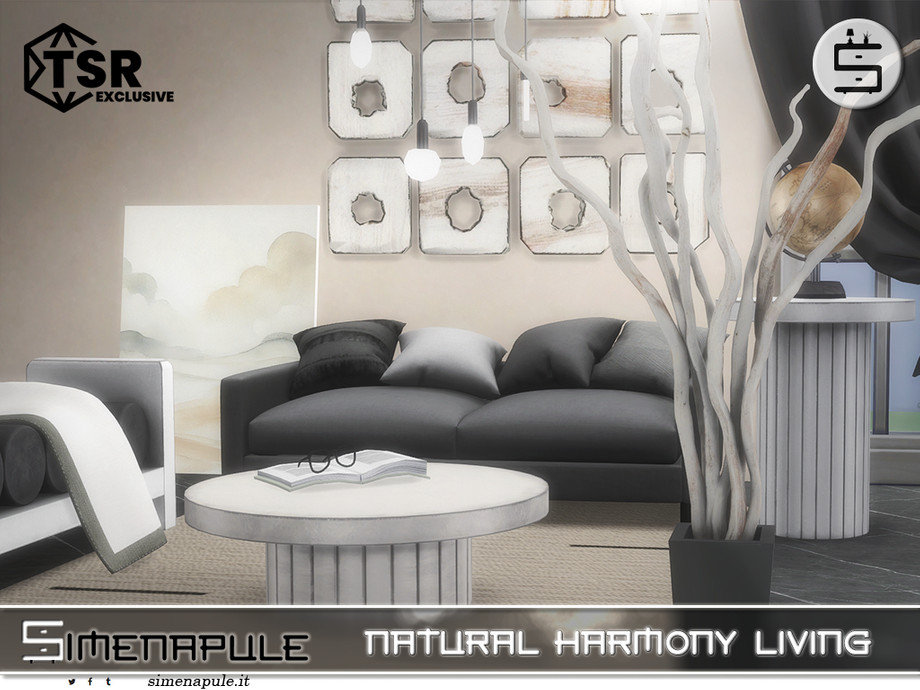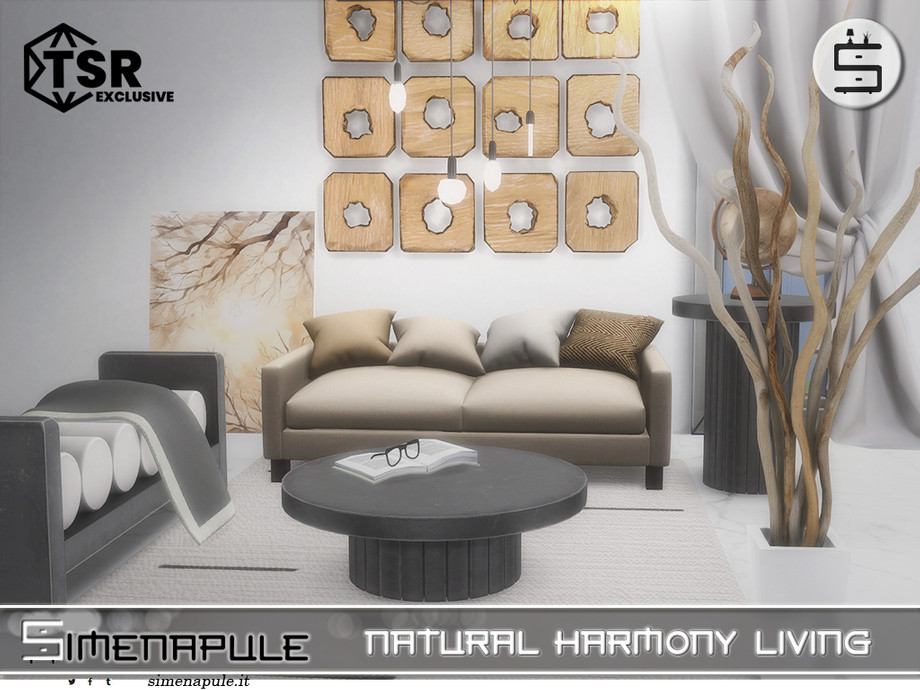 Create a calm and modern living space with the Natural Harmony set. This collection features clean lines, soft tones, and natural elements like wood textures and decorative branches, bringing a warm and relaxing atmosphere to your Sims home. Perfect for contemporary and minimalist interiors.