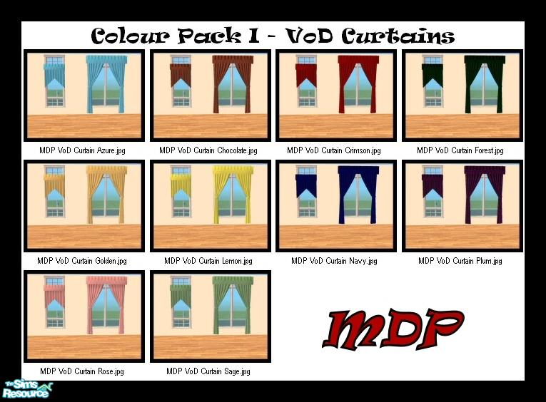 There are 10 colourful curtains in this set. Recolours both the short and long versions. Part of my Colour Pack I. Enjoy! Made w/SimPE. ~Proud to be *TSRAA*!~