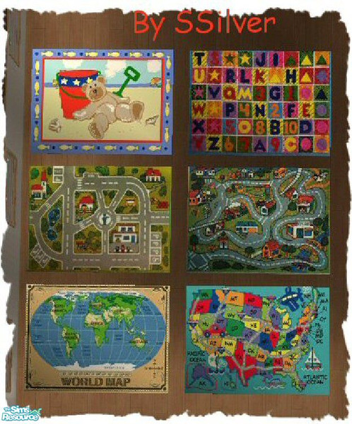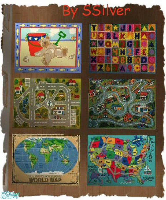 Little Sims need rugs, too! :) Here are 6 "kid inspired" rugs to add to your sim kids' rooms. In order for these rugs to show up in your game, you must have Echo's 3x4 rug mesh installed. To get this, please download Windkeeper's "Real Rug Collection", or you can download it at Modthesims2.