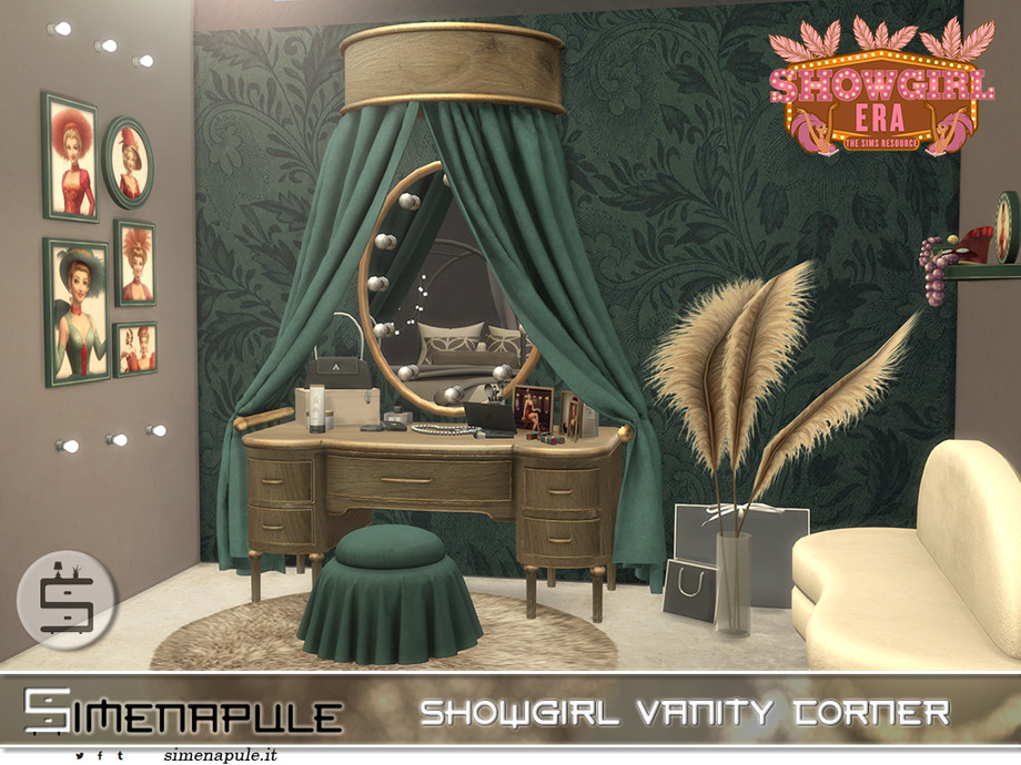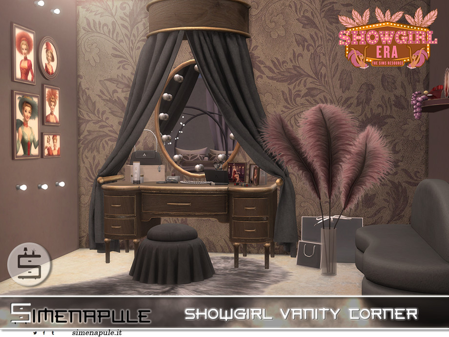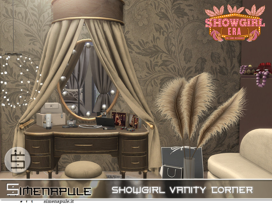 The "Showgirl Era" vanity set captures the golden age of theatrical glamour, bringing vintage burlesque elegance and old Hollywood sophistication to your Sim's boudoir.