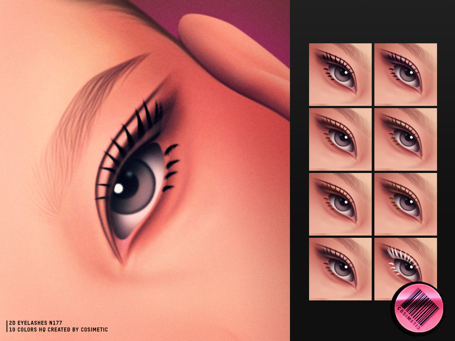 Curved 2D lashes with elongated wispy strands for a lifted eye effect. Adds soft volume while maintaining Maxis Match harmony. Includes 10 colors.