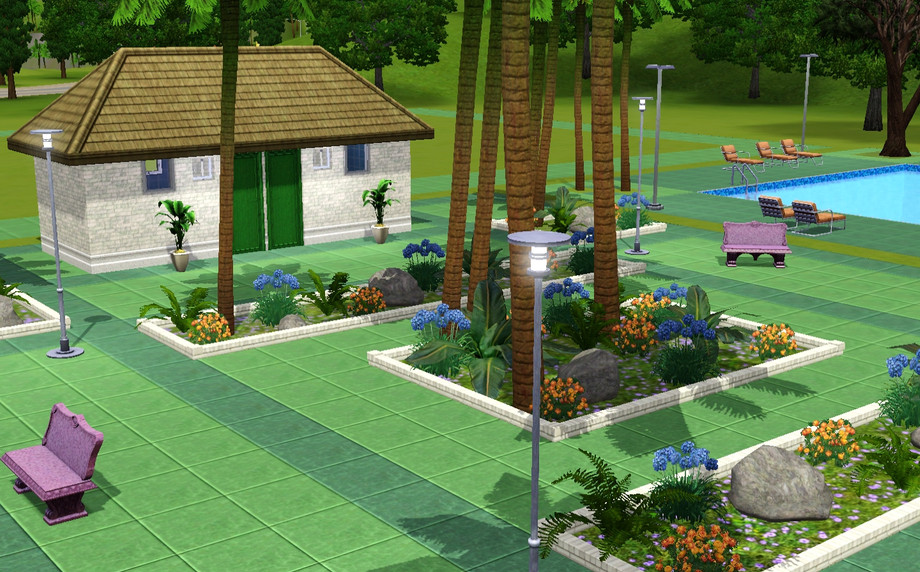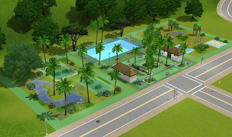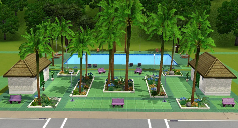 This is one of 4 lots that I have in my modern hood that are where the 3 residences and pool were to the West side of town in SV. This is the lot on the street in front of the pool which is on the back lot. A pic of the whole complex shows how I have it set up in my game. Enjoy!
