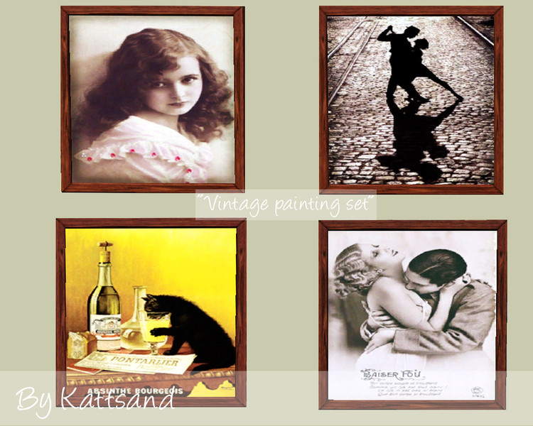 A set of four paintings with motifes with a "vintage feel" to it. The frames are recolorable and the painting is a 1-tile painting.