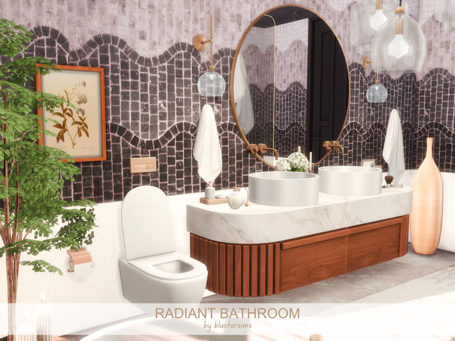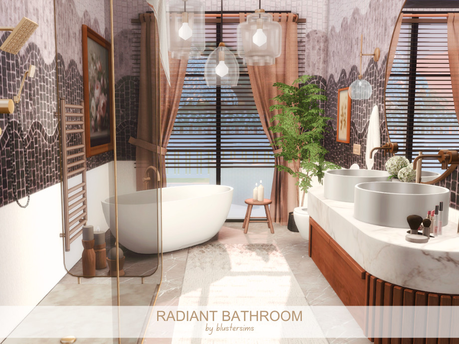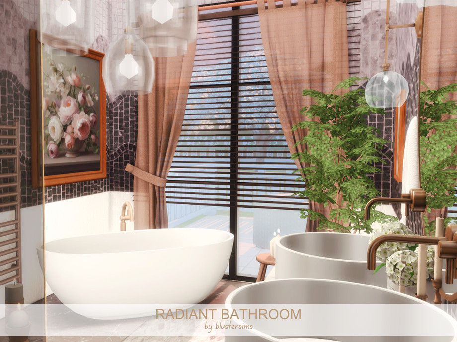 The Radiant Bathroom is a warm, light-filled space blending sculptural tubs, soft pink mosaic tiles, and brushed brass accents, softened by greenery and sheer drapery for a calm, spa-like feel.