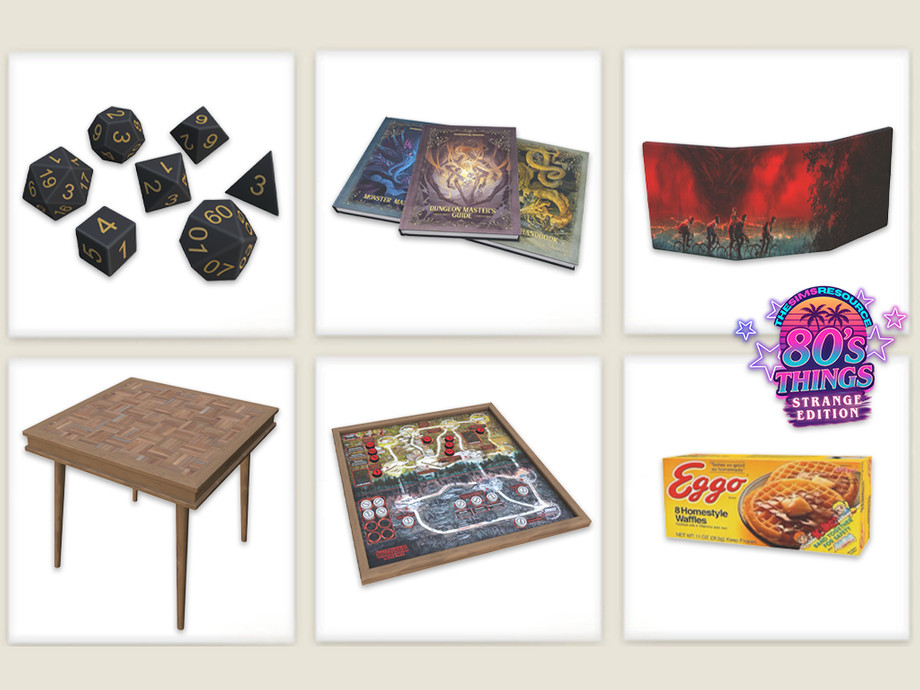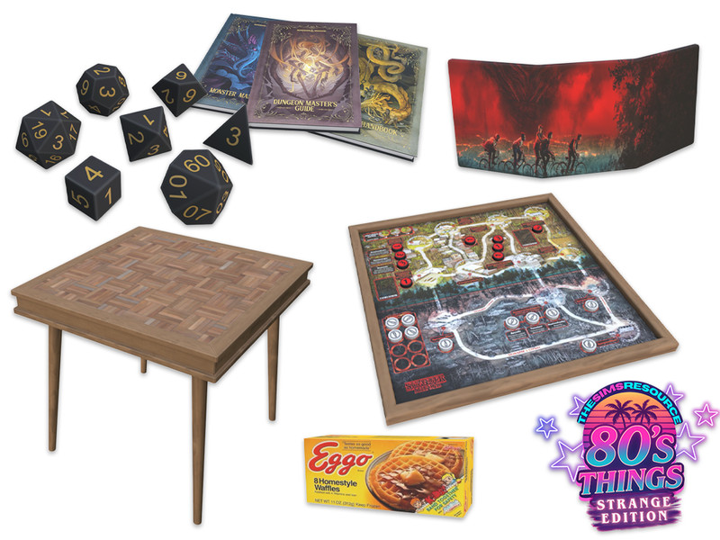 80s Things Stranger Edition Set is base game compatible and consist of 6 items - Table, Playing Board, Privacy Screen, DnD Books, Eggo Box, Dices Happy Simming! :)